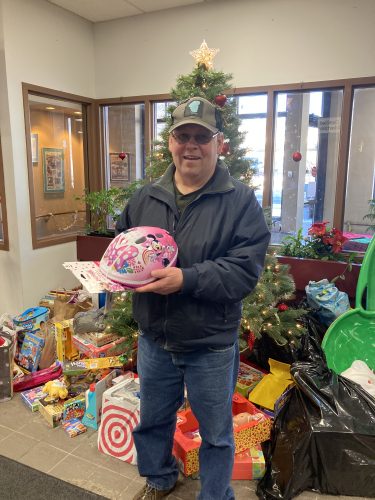 Negaunee resident Danny Thompson donates a bike helmet to the Cheer Club. The Cheer Club collected unwrapped toys and gifts throughout the holiday season to be donated to local children and families in need through the Salvation Army and St. Vincent de Paul. (Journal photo by Taylor Johnson)