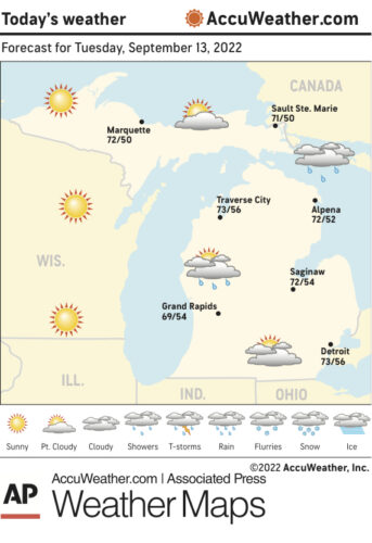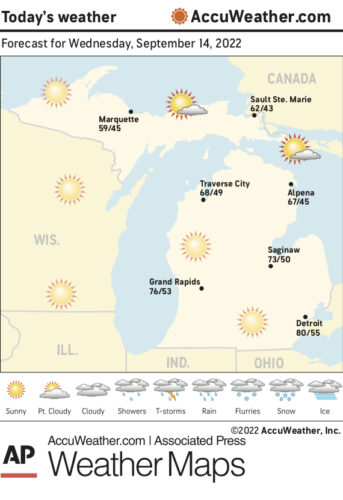 Marquette and vicinity: Today, sunny. Highs around 72. Temperature falling into the middle 60s in the afternoon. Northwest winds 5 to 10 mph, becoming north in the afternoon. Tonight, partly cloudy. Lows 47 to 52. North winds 5 to 10 mph.