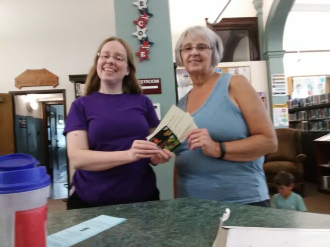 Negaunee Public Library Director Jessica Holman, left, presents Anna Mattson with prizes for being the third winner of the adult summer reading program. Mattson won gift cards to Iron Town Pasties, Super One Foods of Negaunee, and Taiga Games. The summer reading program ended July 29.