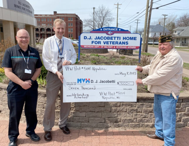 VFW Grant-Nyman Post 5014 Republic presented a $7,000 donation for life enriching activities for the veteran members at MVH D.J. Jacobetti. One of Post 5014 fundraisers that supported this donation included collecting 1,148,160 can tabs. Photo: Cary Lincoln, DON; Ron Oja, Administrator both ...
