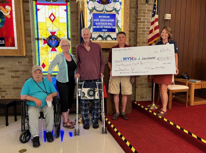 Marquette Elks present a check for $1,001.97 to the D.J. Jacobetti Veterans Home. These funds were made available through the Michigan Elks Veterans Association and will be used for equipment to enrich the lives of the residents of the home. Pictured here L-R are resident Blaine Marceau, Elks ...