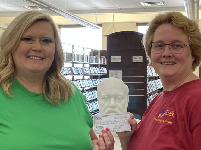 Heather Steltenpohl, left, Development Director at Peter White Public Library in Marquette, receives a check from Melissa Wilson, Regent of the Onagomingkway Chapter, National Society Daughters of the American Revolution. The chapter donation will help with digitizing the Mining Journal ...