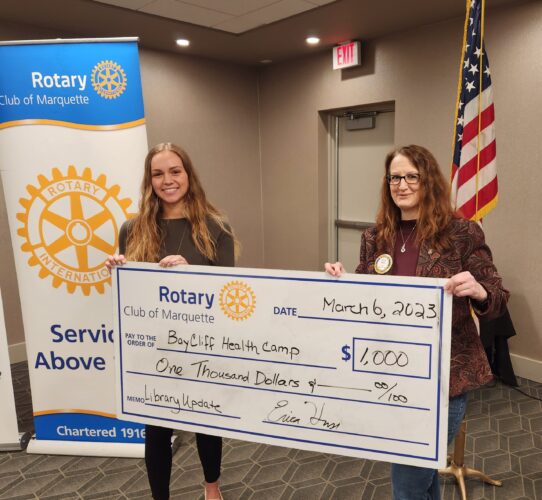 Kelsey Clark receives a contribution from President Erica Huss of the Rotary Club of Marquette on behalf of Bay Cliff Health Camp. The funds will be used to update their library. Rotary is a world community of 1.2 million business and professional men and women. They are organized into 30,000 ...