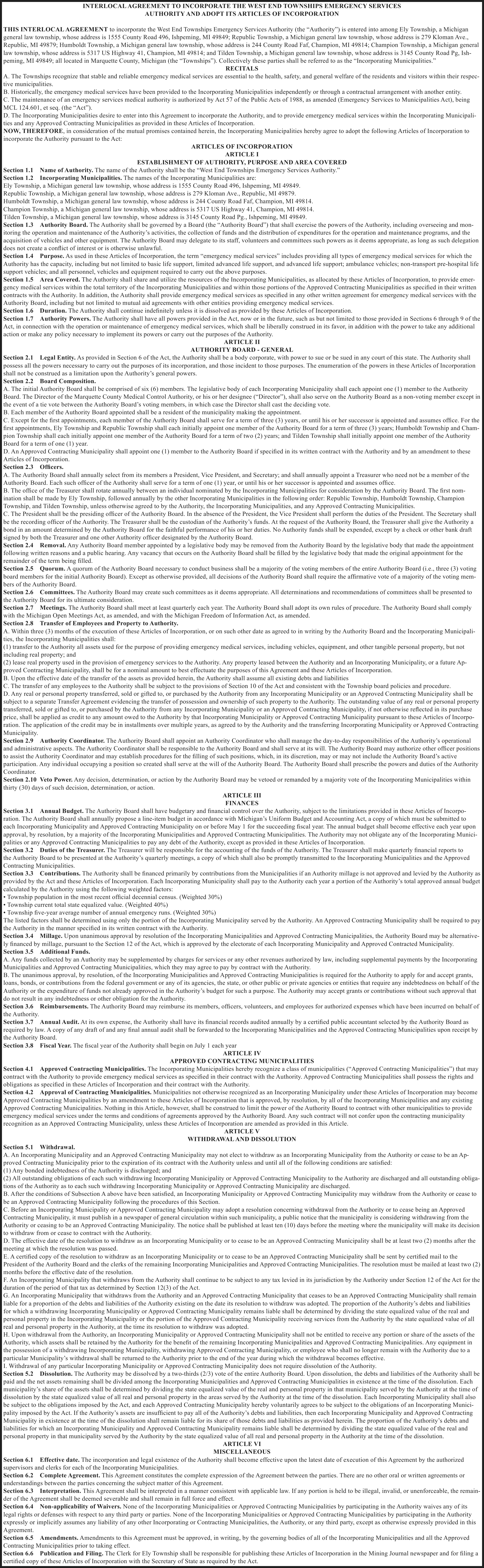 NOW THEREFORE, NOTICE IS HEREBY GIVEN, that by Virtue of the power of sale contained in said Mortgage and in pursuance of the statute on such case made and provided, the said Mortgage will be foreclosed by a sale of the premises therein described or so much thereof as may be necessary, at public auction, to the highest bidder, at immediately inside the front door of the County Courthouse in the City of Marquette and County of Marquette, Michigan, that being the place of holding of the Circuit Court in and for said County, on Thursday, June 16, 2022 at 10:00 o’clock a.m. local time in the forenoon of said day, and said premises will be sold to pay the amount so as aforesaid then due on said Mortgage together with 6.5% interest rate, legal costs, attorney fees, and also any taxes and insurance that said Mortgagee does pay on or prior to the date of said sale; which said premises are described in said Mortgage as follows, to-wit: