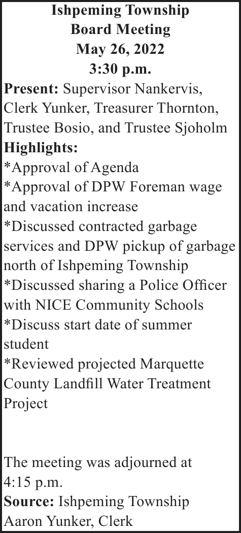 Notice is given under section 3212 of the revised judicature act of 1961, 1961 PA 236, MCL 600.3212, that the following mortgage will be foreclosed by a sale of the mortgaged premises, or some part of them, at a public auction sale to the highest bidder for cash or cashier’s check at the place of holding the circuit court in Marquette County, starting promptly at 10:00 AM, on June 16, 2022. The amount due on the mortgage may be greater on the day of sale. Placing the highest bid at the sale does not automatically entitle the purchaser to free and clear ownership of the property. A potential purchaser is encouraged to contact the county register of deeds office or a title insurance company, either of which may charge a fee for this information:
