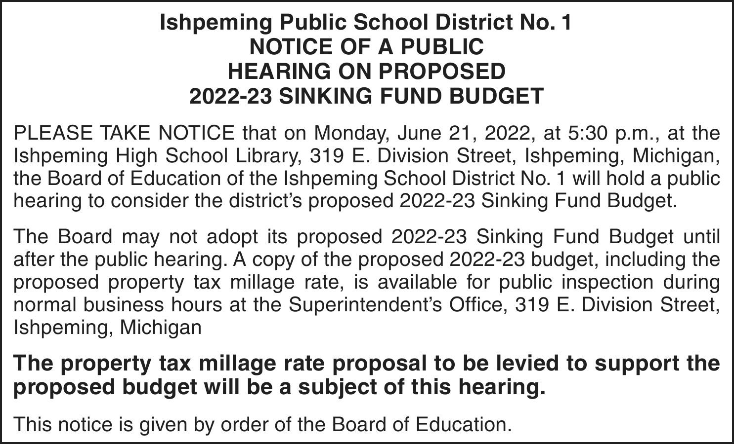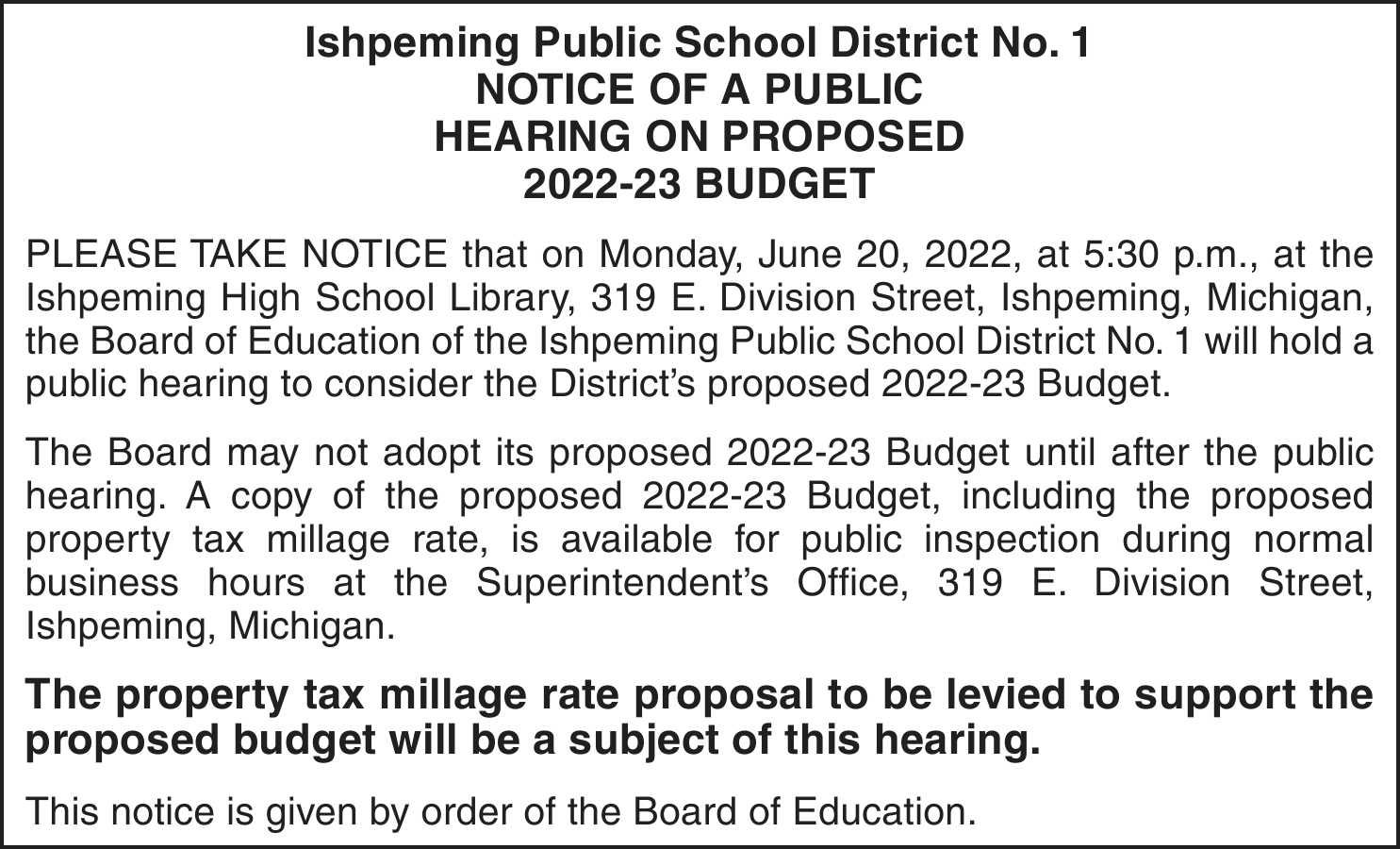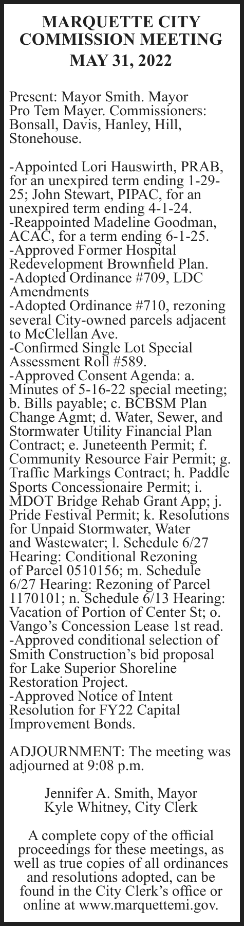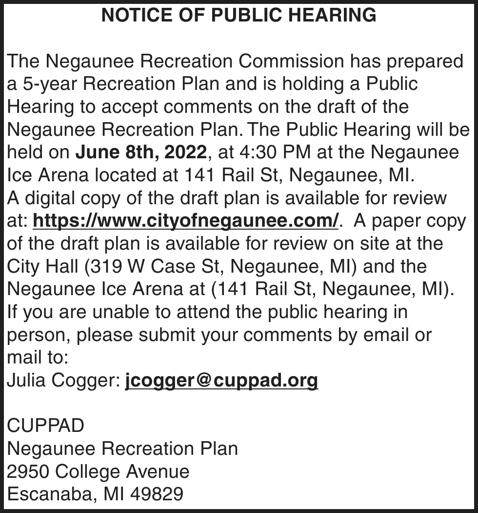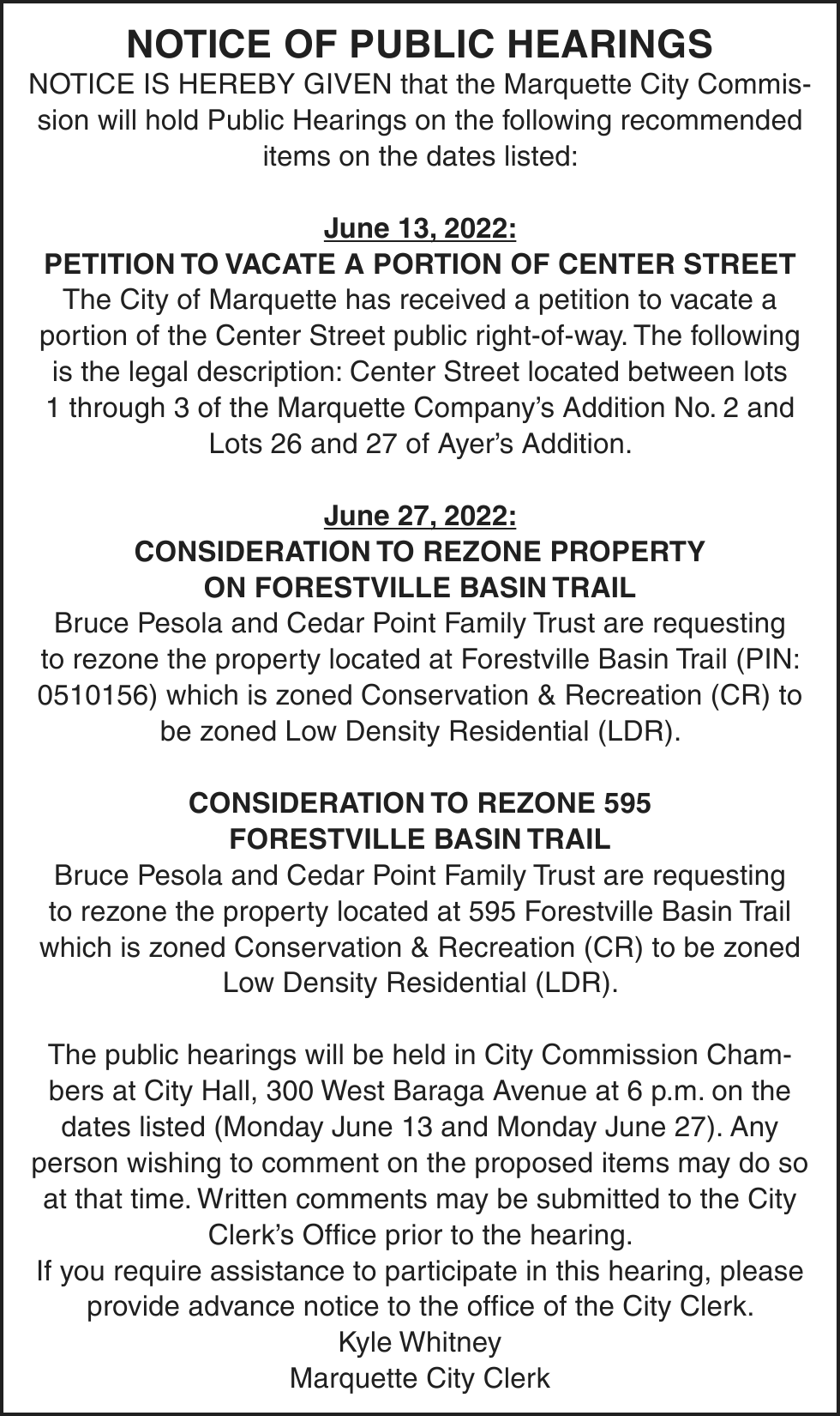 TAKE NOTICE: A hearing will be held on Wednesday, June 15, 2022 at 9:30am (EST) at Marquette County Probate Court before HON. Charles C. Nebel to change the name of: Madison Ann Marie Hayward to Madison Ann McNeely