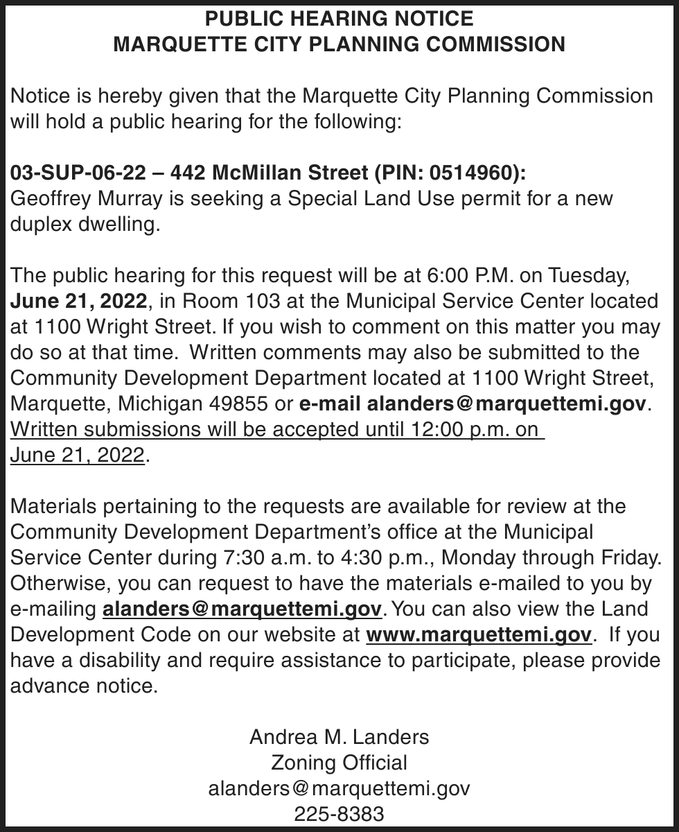 Court address 234 W. Baraga Ave., Marquette, MI 49855