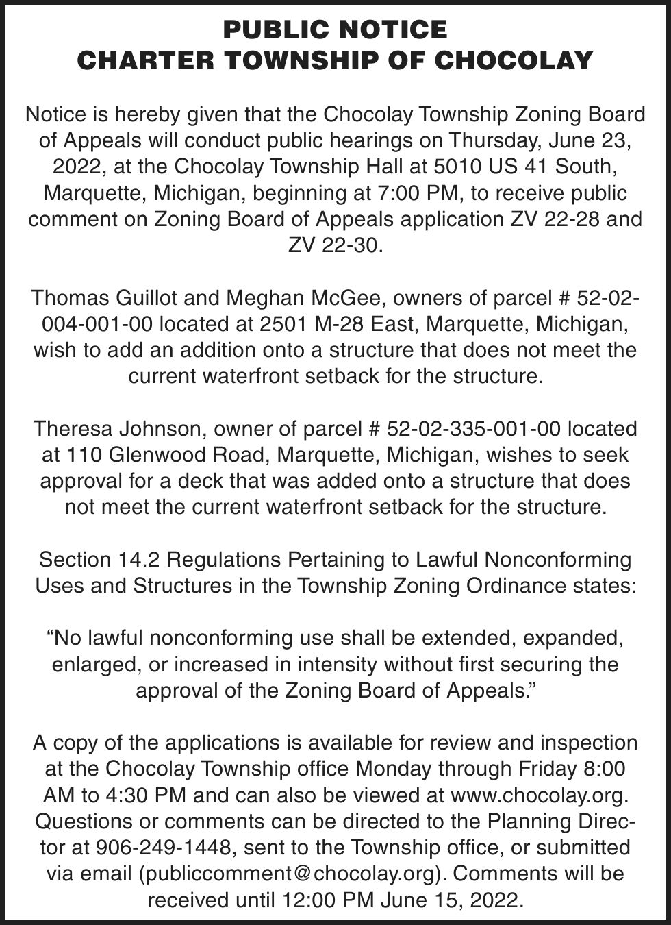 TAKE NOTICE: A hearing will be held on TUESDAY, June 21, 2022, at 2:00pm (EST), at Marquette County Probate Court, 234 W. Baraga Ave., Marquette, MI 49855, before HON. CHERYL L. HILL to change the name of: James Patrick Chartre to Elizabeth Kristine Chartre