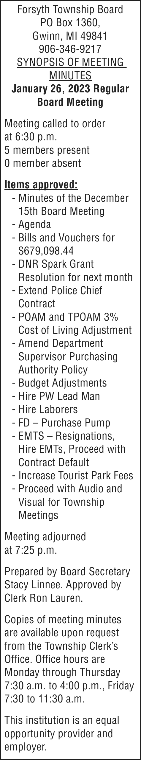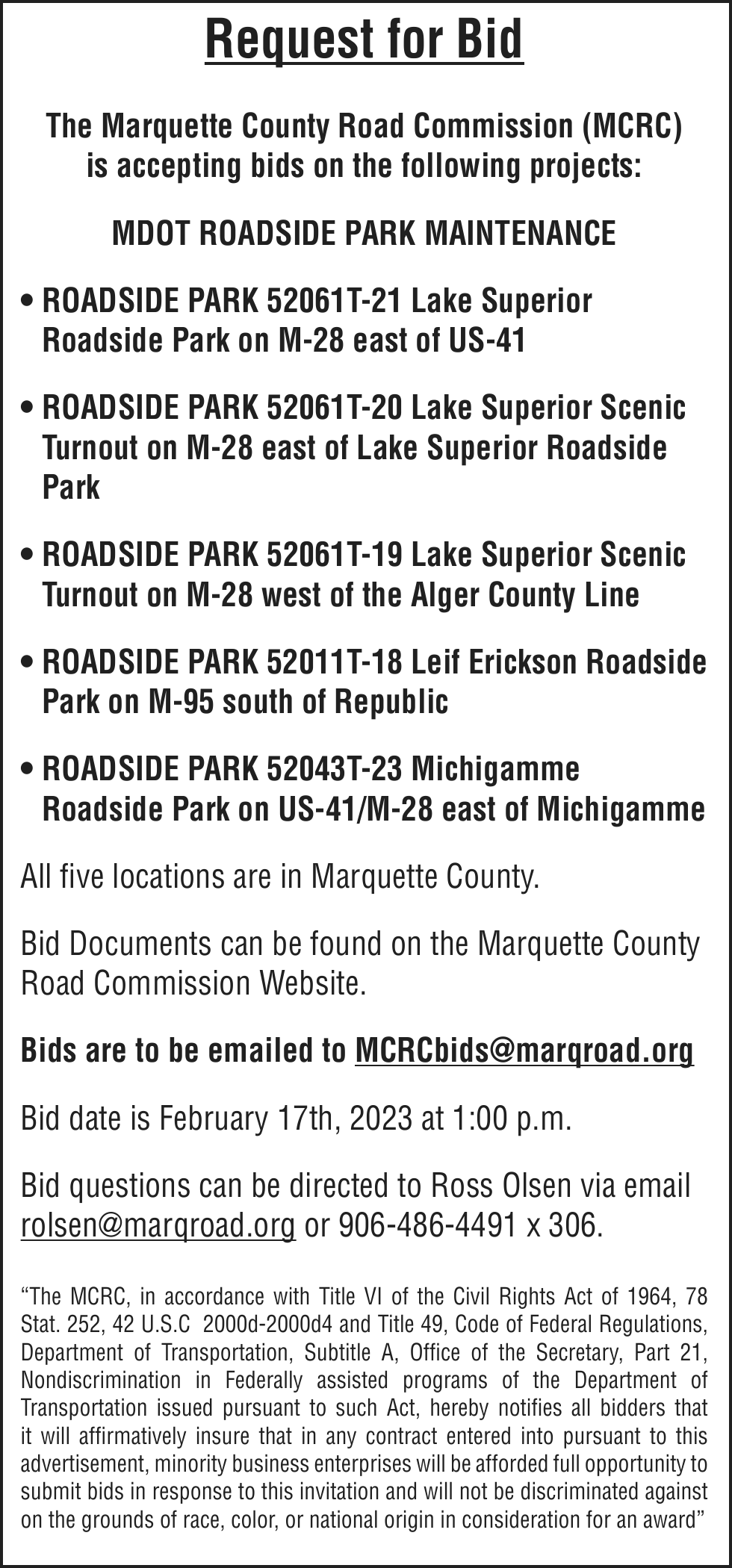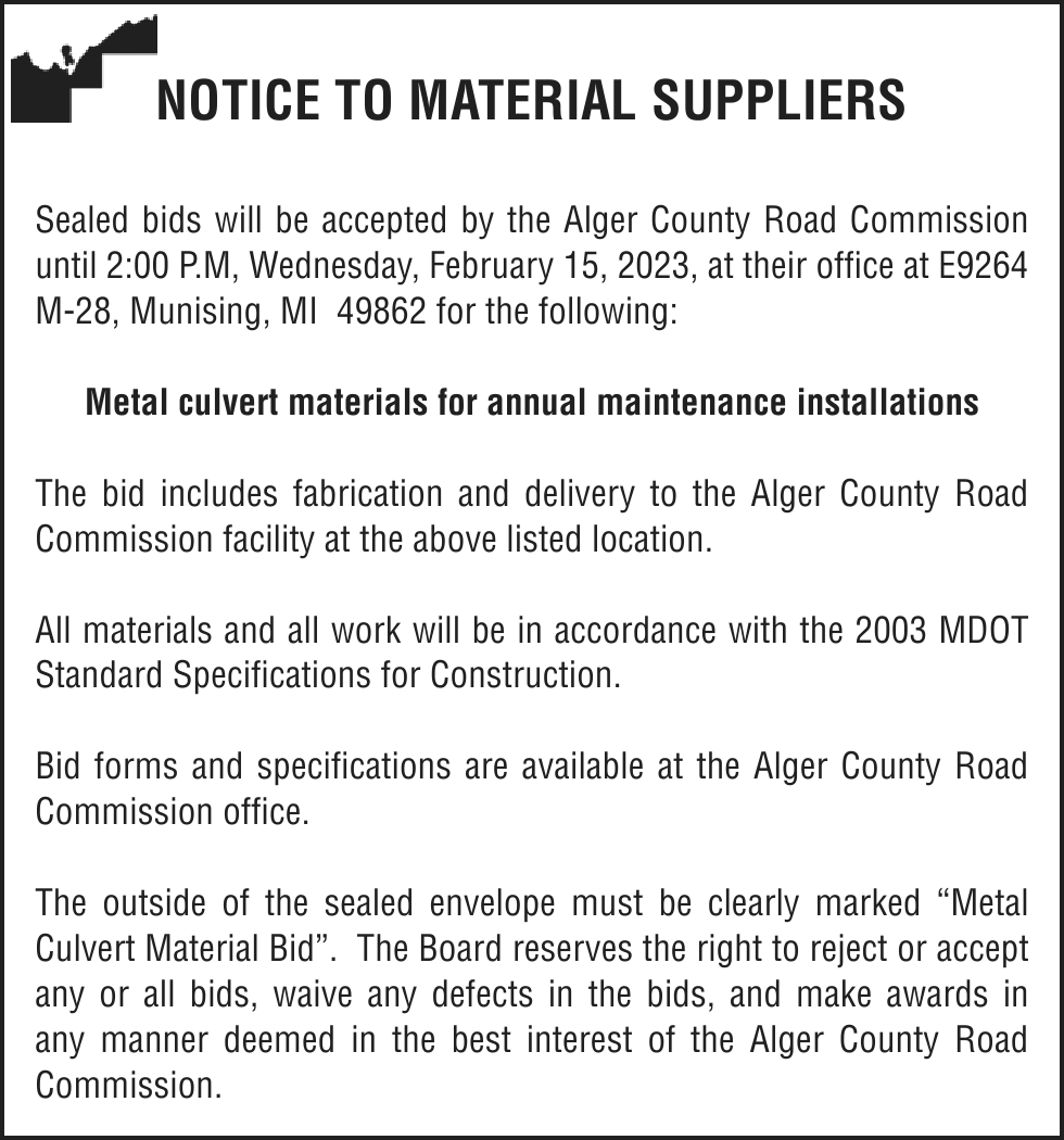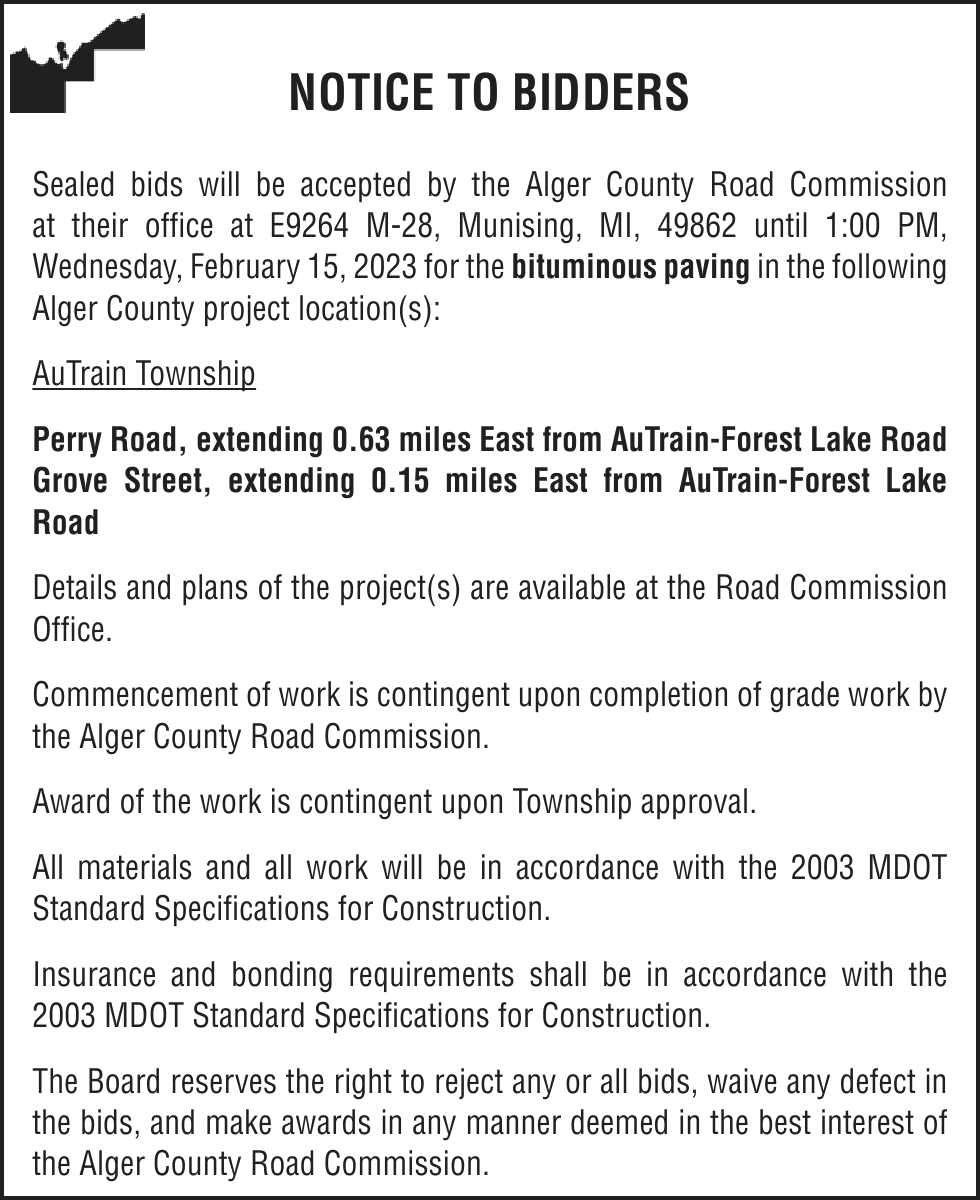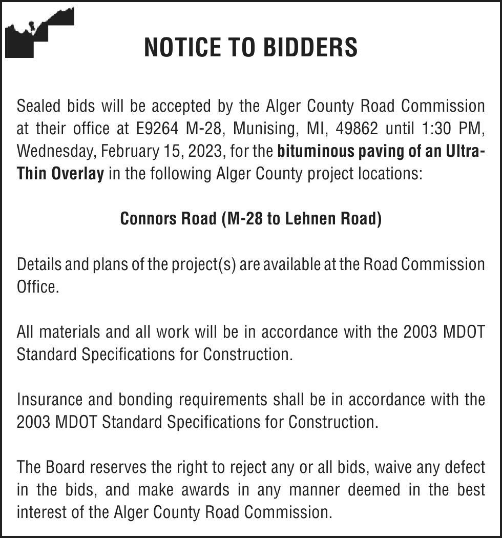Notice is given under section 3212 of the revised judicature act of 1961, 1961 PA 236, MCL 600.3212, that the following mortgage will be foreclosed by a sale of the mortgaged premises, or some part of them, at a public auction sale to the highest bidder for cash or cashier’s check at the place of holding the circuit court in Marquette County, starting promptly at 10:00 AM, on February 16, 2023. The amount due on the mortgage may be greater on the day of sale. Placing the highest bid at the sale does not automatically entitle the purchaser to free and clear ownership of the property. A potential purchaser is encouraged to contact the county register of deeds office or a title insurance company, either of which may charge a fee for this information: