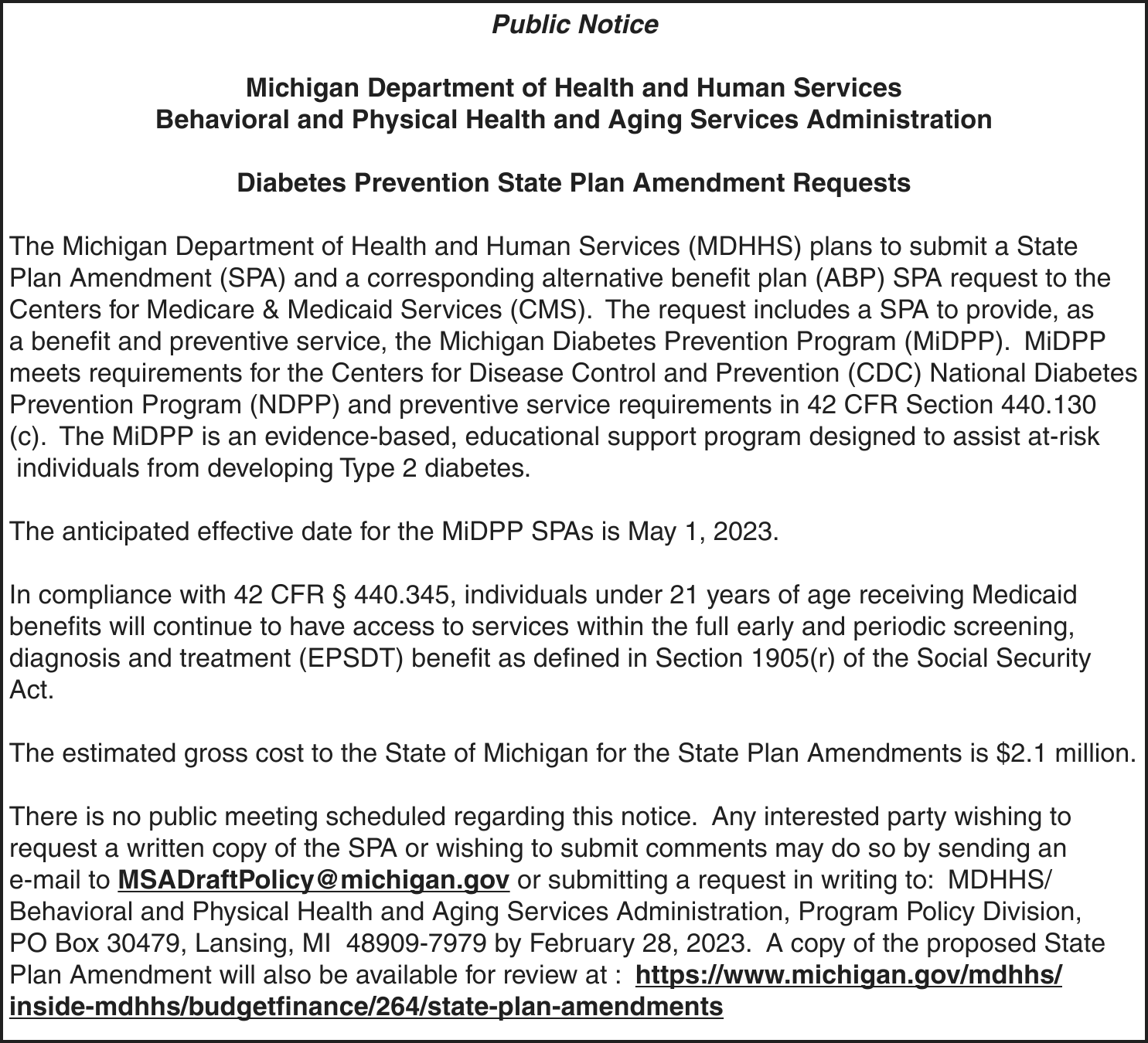 TAKE NOTICE: A hearing will be held on February 21, 2023 at 1:30pm (EST) at Marquette County Probate Court before HON. CHERYL L. HILL to change the name of: Elana Grace Owens to Hyde Alexander Whitney