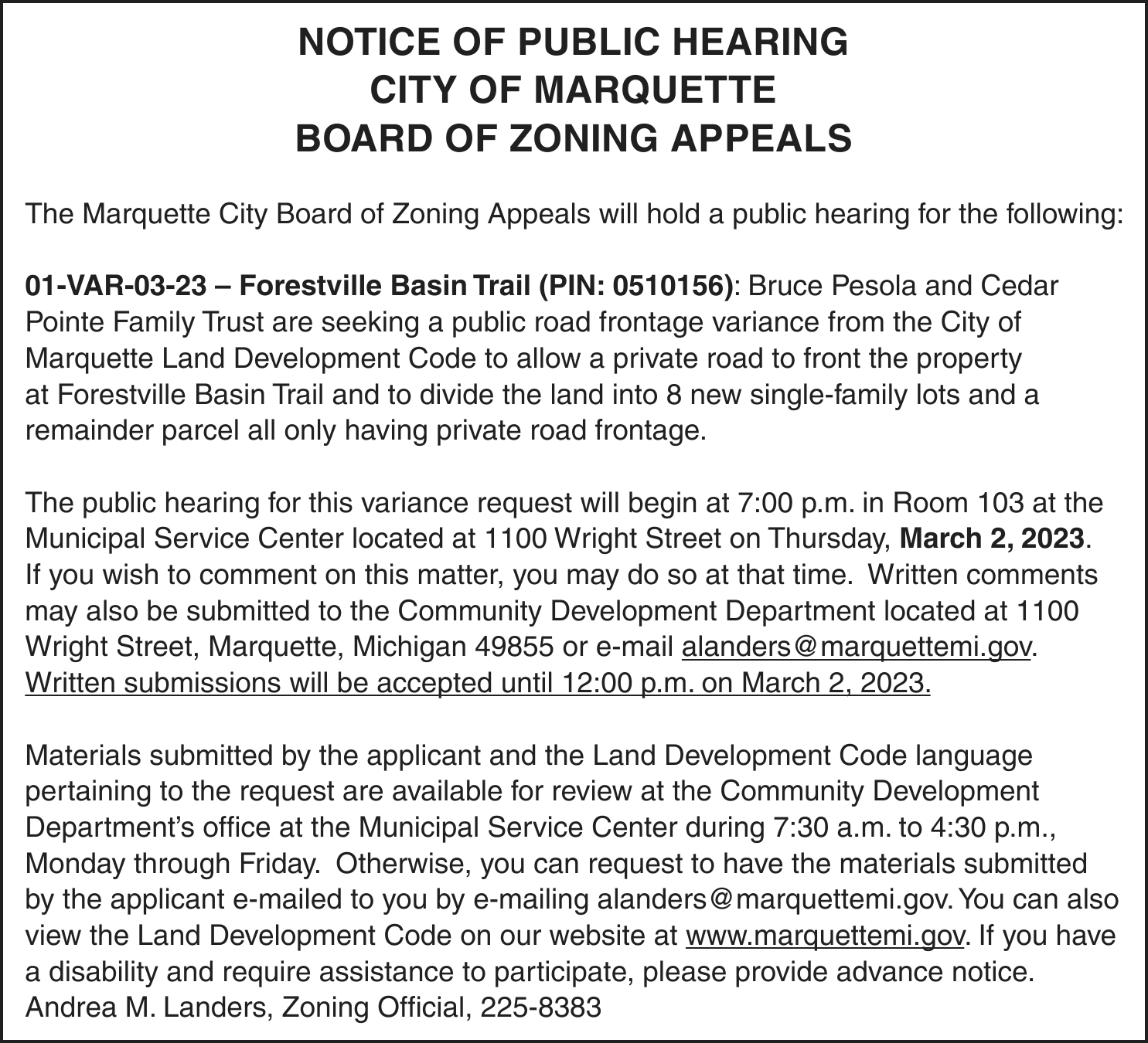 Court address – 234 W. Baraga Ave., Marquette, MI 49855