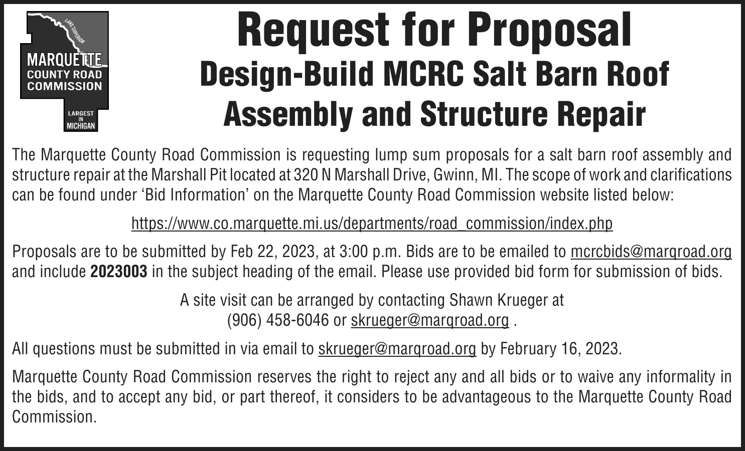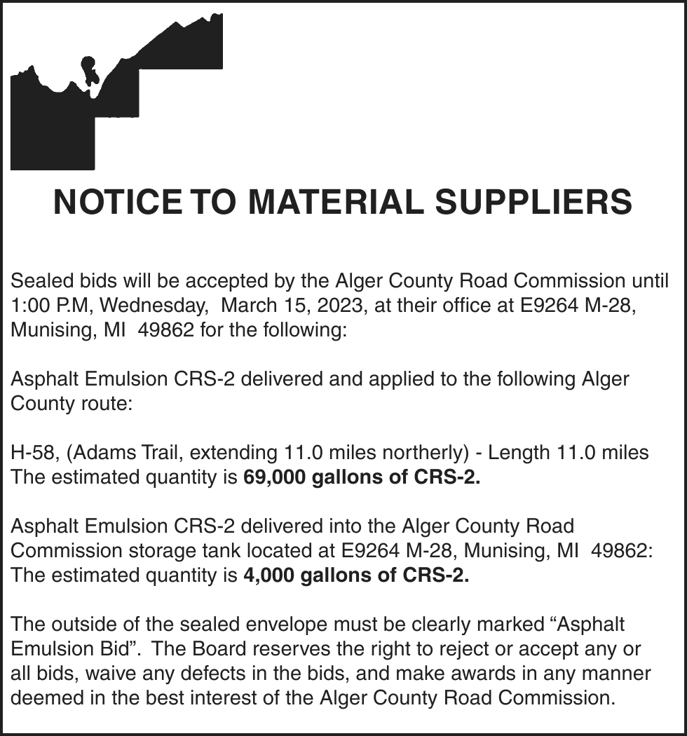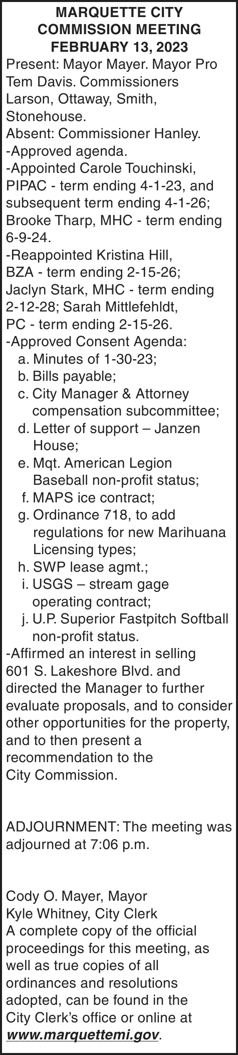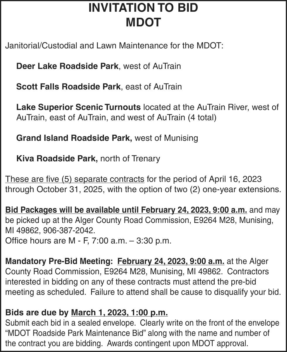 NOTICE OF MORTGAGE FORECLOSURE SALE Notice of foreclosure by advertisement. Notice is given under section 3212 of the revised judicature act of 1961, 1961 PA 236, MCL 600.3212, that the following mortgage will be foreclosed by a sale of the mortgaged premises, or some part of them, at a public auction sale to the highest bidder for cash or cashier’s check at the place of holding the circuit court in Marquette County, starting promptly at 10:00 AM on February 16, 2023. The amount due on the mortgage may be greater on the day of the sale. Placing the highest bid at the sale does not automatically entitle the purchaser to free and clear ownership of the property. A potential purchaser is encouraged to contact the county register of deeds office or a title insurance company, either of which may charge a fee for this information. MORTGAGE SALE -Janice Helen Peterson, original mortgagor, granted a Mortgage to United States of America, acting through the Rural Housing Service, its successors and assigns, United States Department of Agriculture, dated January 22, 2009, and recorded January 23, 2009 as Instrument Number 2009R-00780, in official records of Marquette County Register of Deeds, Michigan, which mortgage there is claimed to be due at the date hereof the sum of $162,915.13. The following described premises situated in the Township of Marquette, County of Marquette, State of Michigan, to-wit: Lots 51 and 52, Trowbridge Park Subdivision No. 2, according to the plat thereof as recorded in Liber 4 of Plats, Page 13 (now Liber 12 of Plats, Page 61A), Marquette County Records. Commonly known as 2203 Huron Street, Marquette, MI 49855 Property ID# 52-08-310-024-00 The redemption period shall be 6 months from the date of such sale, unless determined abandoned in accordance with MCLA 600.3241, in which case the redemption period shall be 1 month, or under MCL 600.3241a 30 days from the date of such sale, or 15 days from the MCL 600.3241a (b) notice, whichever is later, or extinguished pursuant to MCL 600.3238. If the property is sold at foreclosure sale under Chapter 32 of the Revised Judicature Act of 1961, pursuant to MCL 600.3278 the borrower will be held responsible to the person who buys the property at the mortgage foreclosure sale or to the mortgage holder for damaging the property during the redemption period. ATTENTION HOMEOWNER: If you are a military service member on active duty, if your period of active duty has concluded less than 90 days ago, or if you have been ordered to active duty, please contact the attorney for the party foreclosing the mortgage at the telephone number stated in this notice ATTENTION PURCHASERS: This sale may be rescinded by the foreclosing mortgagee. In that event, your damages, if any, shall be limited solely to the return of the bid amount tendered at sale, plus interest. This notice is from a debt collector. Dated: January 9, 2023 For more information, please call: (513) 852-6066 Daniel A. Cox Wood + Lamping, LLP Attorneys for Servicer 600 Vine Street, Suite 2500, Cincinnati, OH 45202 File 22-11059