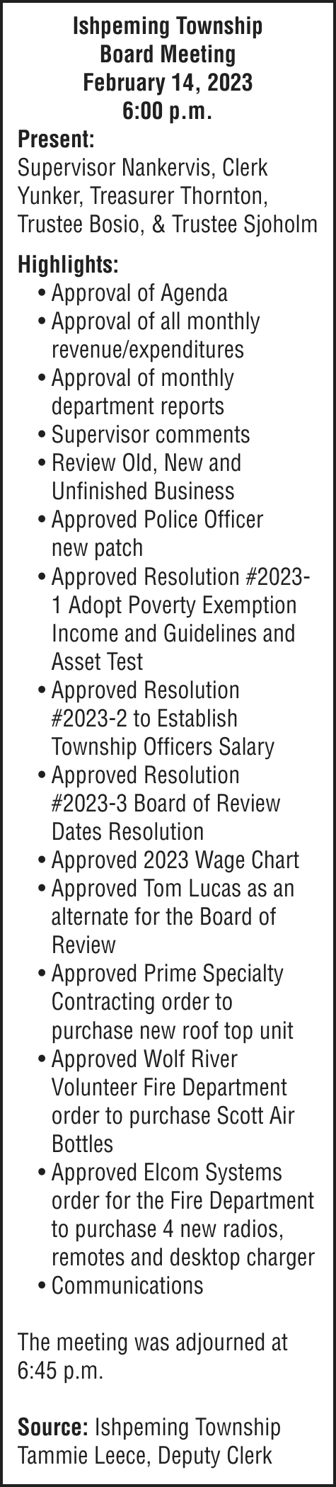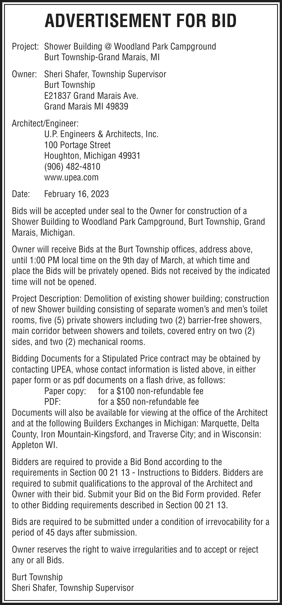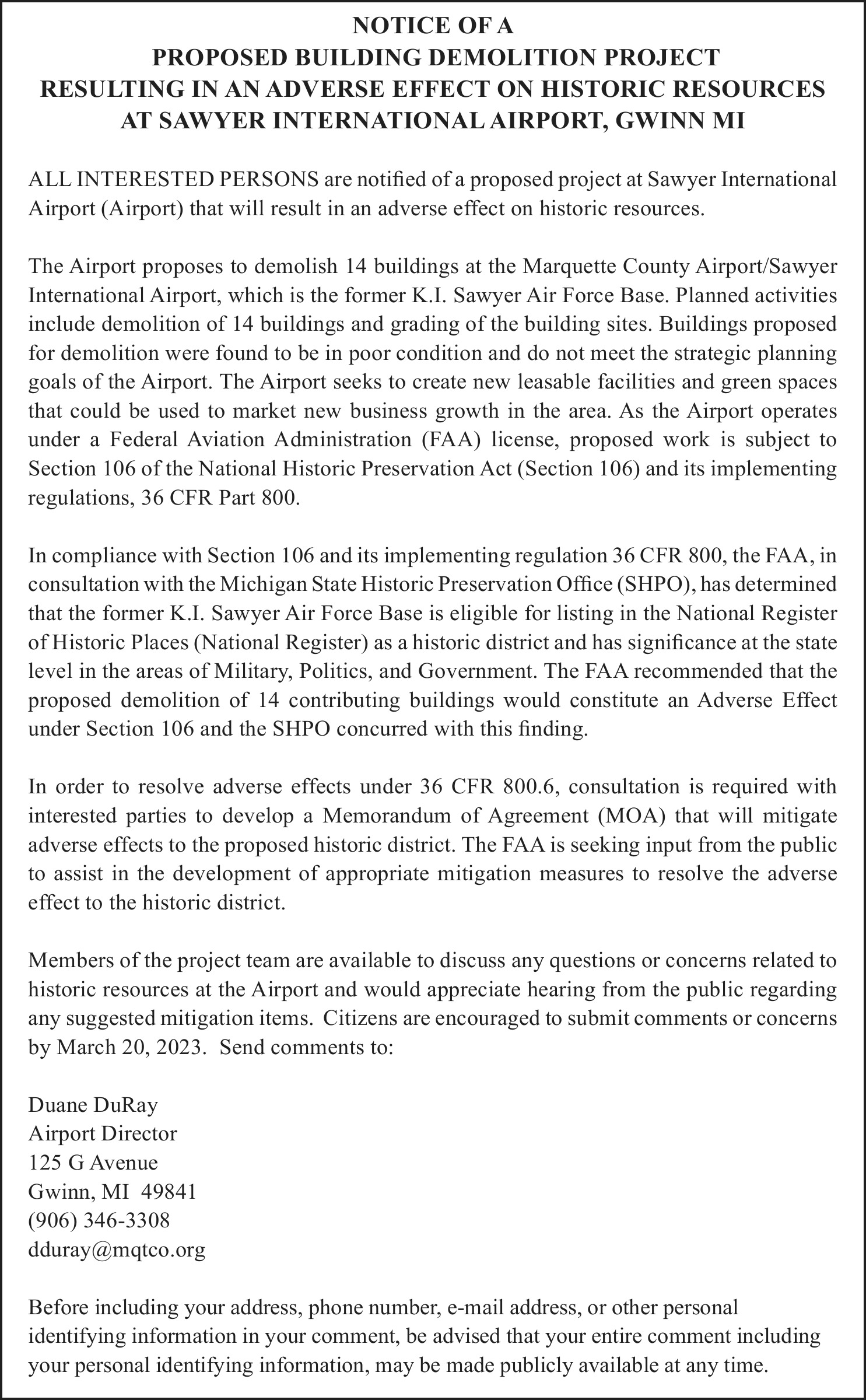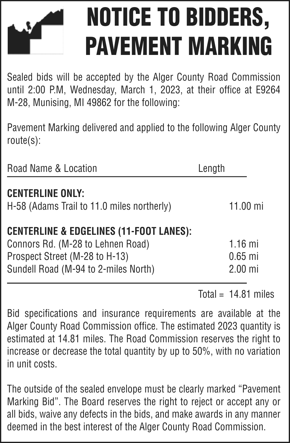 NOTICE OF MORTGAGE FORECLOSURE SALE Notice of foreclosure by advertisement. Notice is given under section 3212 of the revised judicature act of 1961, 1961 PA 236, MCL 600.3212, that the following mortgage will be foreclosed by a sale of the mortgaged premises, or some part of them, at a public auction sale to the highest bidder for cash or cashier’s check at the place of holding the circuit court in Marquette County, starting promptly at 10:00 AM on February 16, 2023. The amount due on the mortgage may be greater on the day of the sale. Placing the highest bid at the sale does not automatically entitle the purchaser to free and clear ownership of the property. A potential purchaser is encouraged to contact the county register of deeds office or a title insurance company, either of which may charge a fee for this information. MORTGAGE SALE -Janice Helen Peterson, original mortgagor, granted a Mortgage to United States of America, acting through the Rural Housing Service, its successors and assigns, United States Department of Agriculture, dated January 22, 2009, and recorded January 23, 2009 as Instrument Number 2009R-00780, in official records of Marquette County Register of Deeds, Michigan, which mortgage there is claimed to be due at the date hereof the sum of $162,915.13. The following described premises situated in the Township of Marquette, County of Marquette, State of Michigan, to-wit: Lots 51 and 52, Trowbridge Park Subdivision No. 2, according to the plat thereof as recorded in Liber 4 of Plats, Page 13 (now Liber 12 of Plats, Page 61A), Marquette County Records. Commonly known as 2203 Huron Street, Marquette, MI 49855 Property ID# 52-08-310-024-00 The redemption period shall be 6 months from the date of such sale, unless determined abandoned in accordance with MCLA 600.3241, in which case the redemption period shall be 1 month, or under MCL 600.3241a 30 days from the date of such sale, or 15 days from the MCL 600.3241a (b) notice, whichever is later, or extinguished pursuant to MCL 600.3238. If the property is sold at foreclosure sale under Chapter 32 of the Revised Judicature Act of 1961, pursuant to MCL 600.3278 the borrower will be held responsible to the person who buys the property at the mortgage foreclosure sale or to the mortgage holder for damaging the property during the redemption period. ATTENTION HOMEOWNER: If you are a military service member on active duty, if your period of active duty has concluded less than 90 days ago, or if you have been ordered to active duty, please contact the attorney for the party foreclosing the mortgage at the telephone number stated in this notice ATTENTION PURCHASERS: This sale may be rescinded by the foreclosing mortgagee. In that event, your damages, if any, shall be limited solely to the return of the bid amount tendered at sale, plus interest. This notice is from a debt collector. Dated: January 9, 2023 For more information, please call: (513) 852-6066 Daniel A. Cox Wood + Lamping, LLP Attorneys for Servicer 600 Vine Street, Suite 2500, Cincinnati, OH 45202 File 22-11059