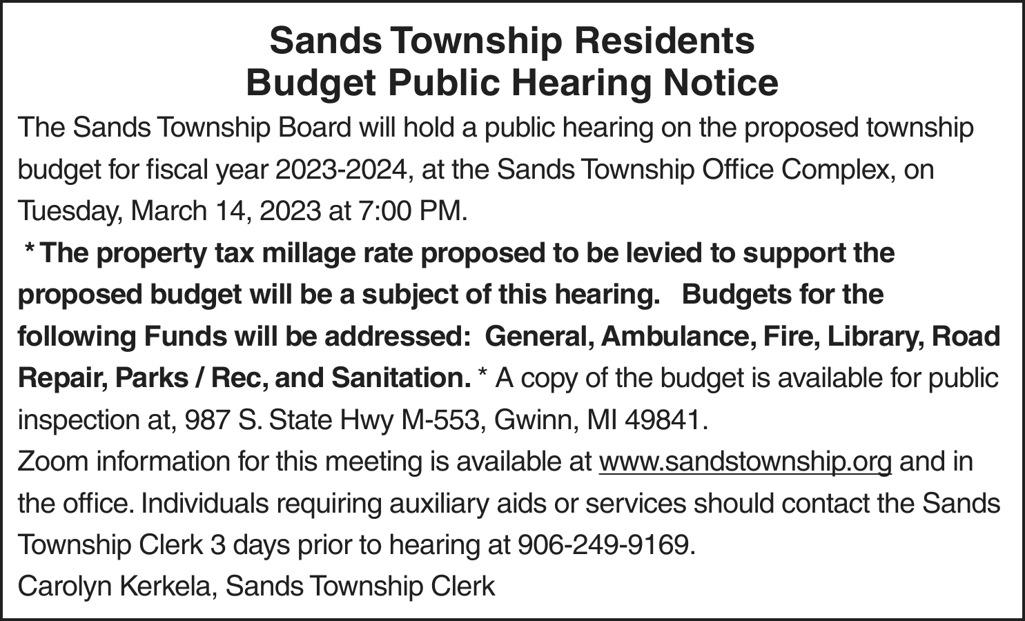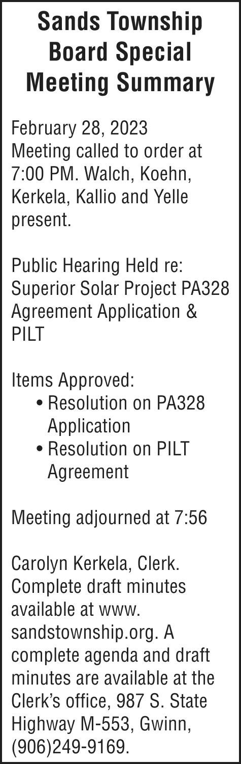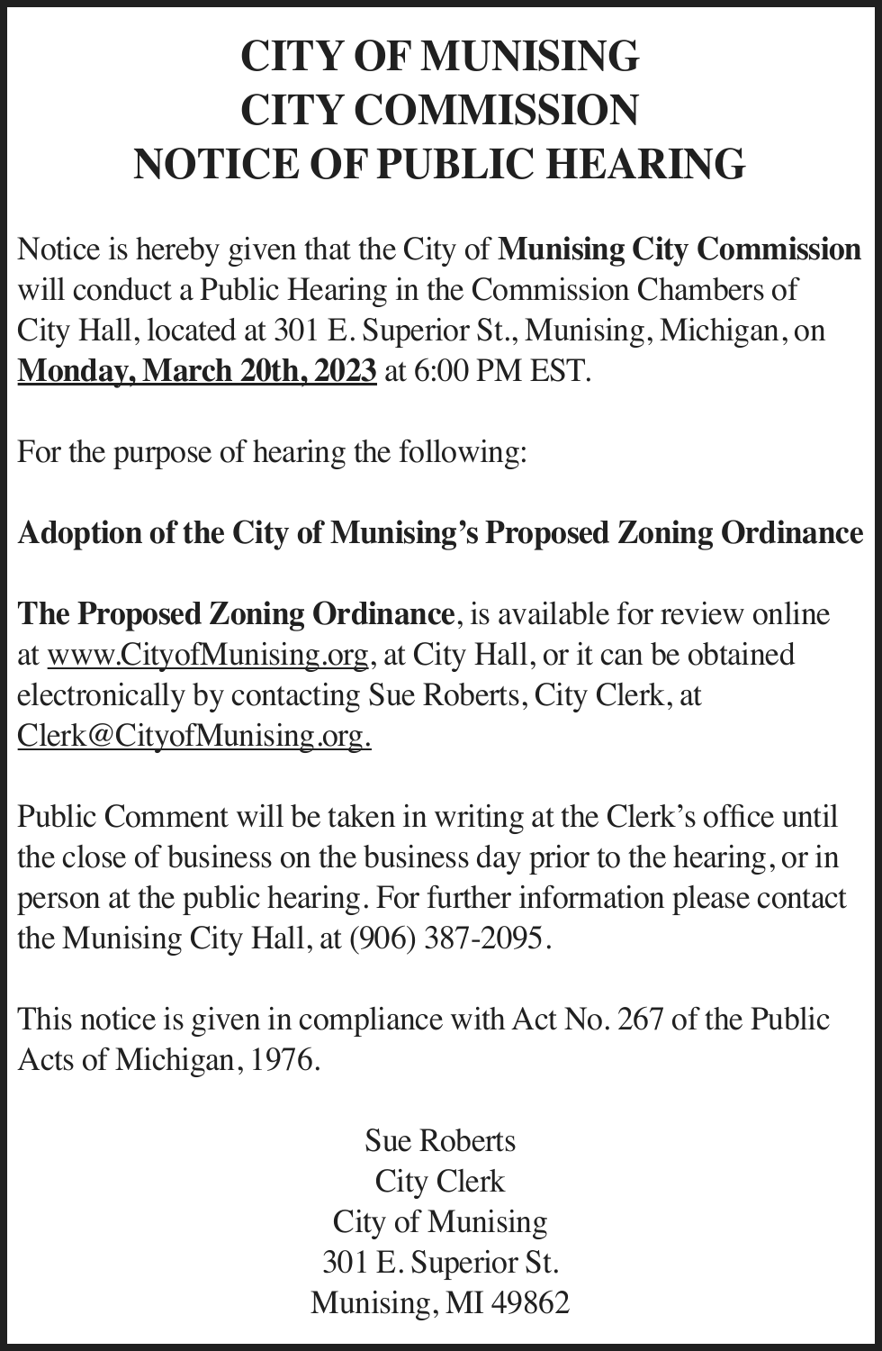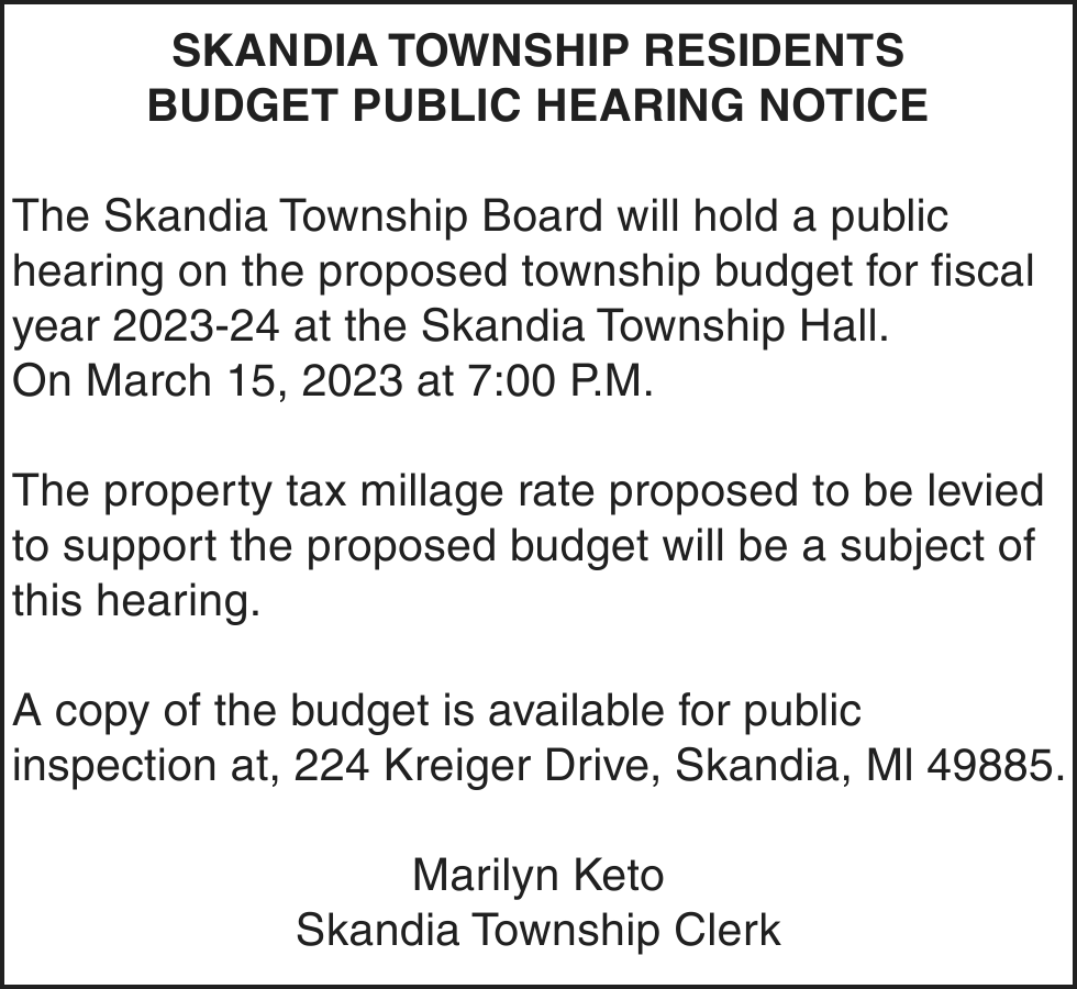 TAKE NOTICE: A hearing will be held on Wednesday, March 29, 2023 at 1:30pm (EST) at Marquette County Probate Court before HON. CHERYL L. HILL to change the name of: Dylan Kenneth Grossman to Dylan Eino Mattila