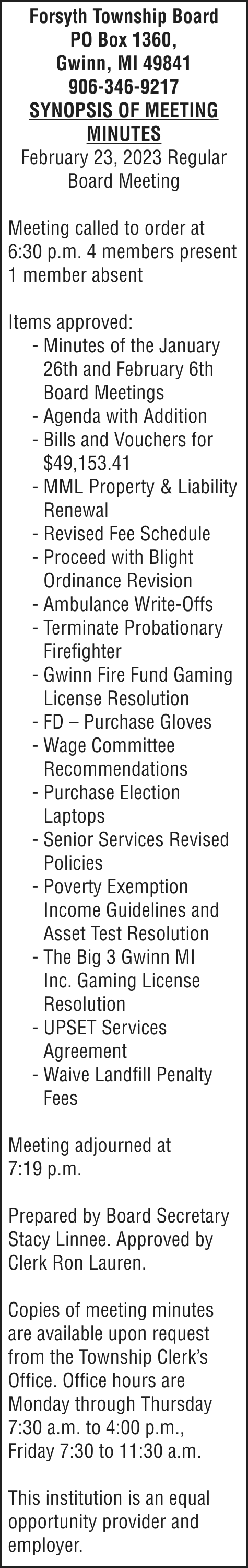 NOTICE TO CREDITORS: The decedent, Claire M. Hirvonen, who lived at 2345 M-28 East, Marquette, MI 49855, died on February 24, 2023. The decedent was the grantor of the Claire M. Hirvonen Trust, dated August 14, 2015.