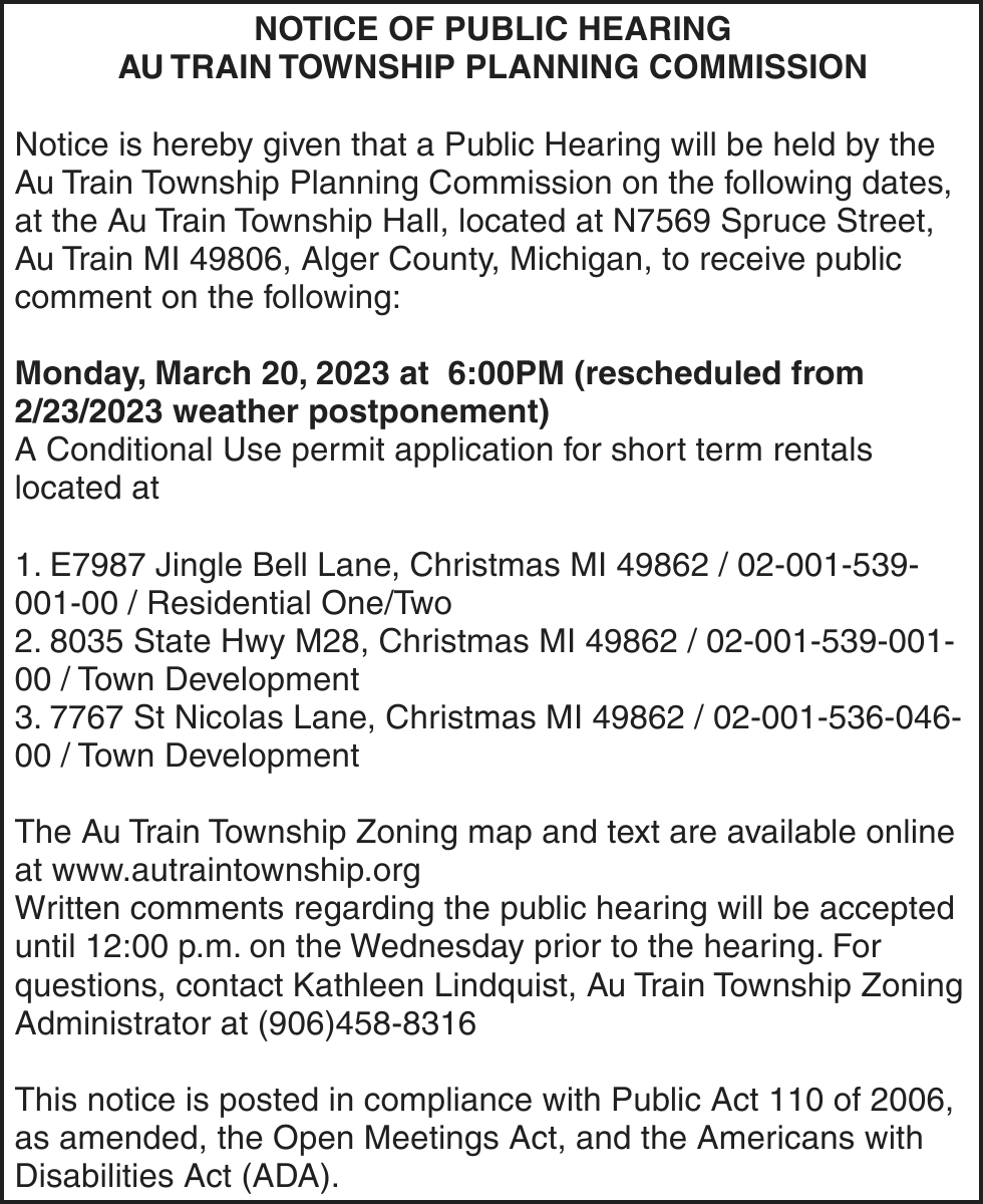 Notice is given under section 3212 of the revised judicature act of 1961, 1961 PA 236, MCL 600.3212, that the following mortgage will be foreclosed by a sale of the mortgaged premises, or some part of them, at a public auction sale to the highest bidder for cash or cashier’s check at the place of holding the circuit court in Marquette County, starting promptly at 10:00 AM, on March 16, 2023. The amount due on the mortgage may be greater on the day of sale. Placing the highest bid at the sale does not automatically entitle the purchaser to free and clear ownership of the property. A potential purchaser is encouraged to contact the county register of deeds office or a title insurance company, either of which may charge a fee for this information: