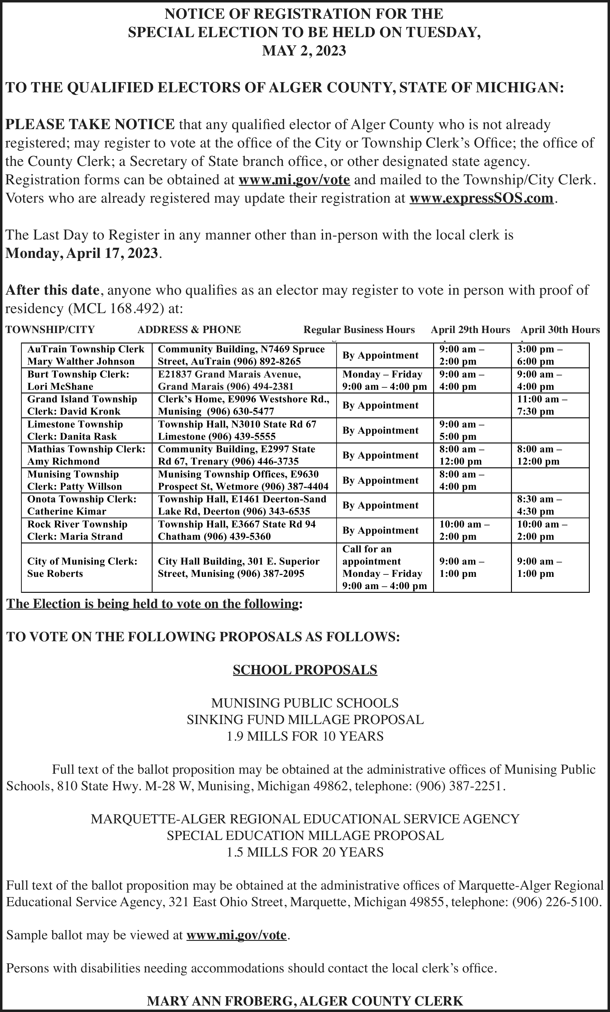 Creditors of the decedent are notified that all claims against the estate will be forever barred unless presented to Kathy L. Monroe, named personal representative, or to both the probate court at 101 Court Street, Munising, MI 49862 and the personal representative within 4 months after the date of publication of this notice.