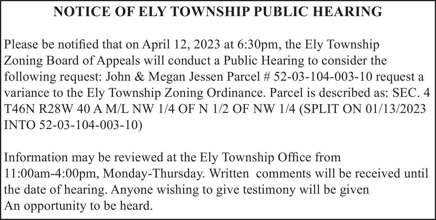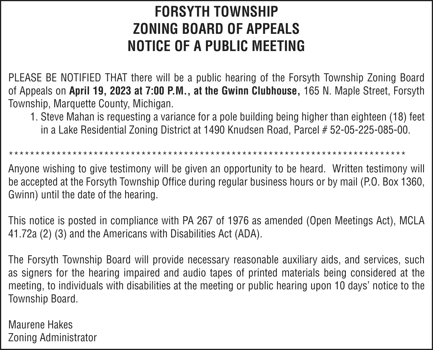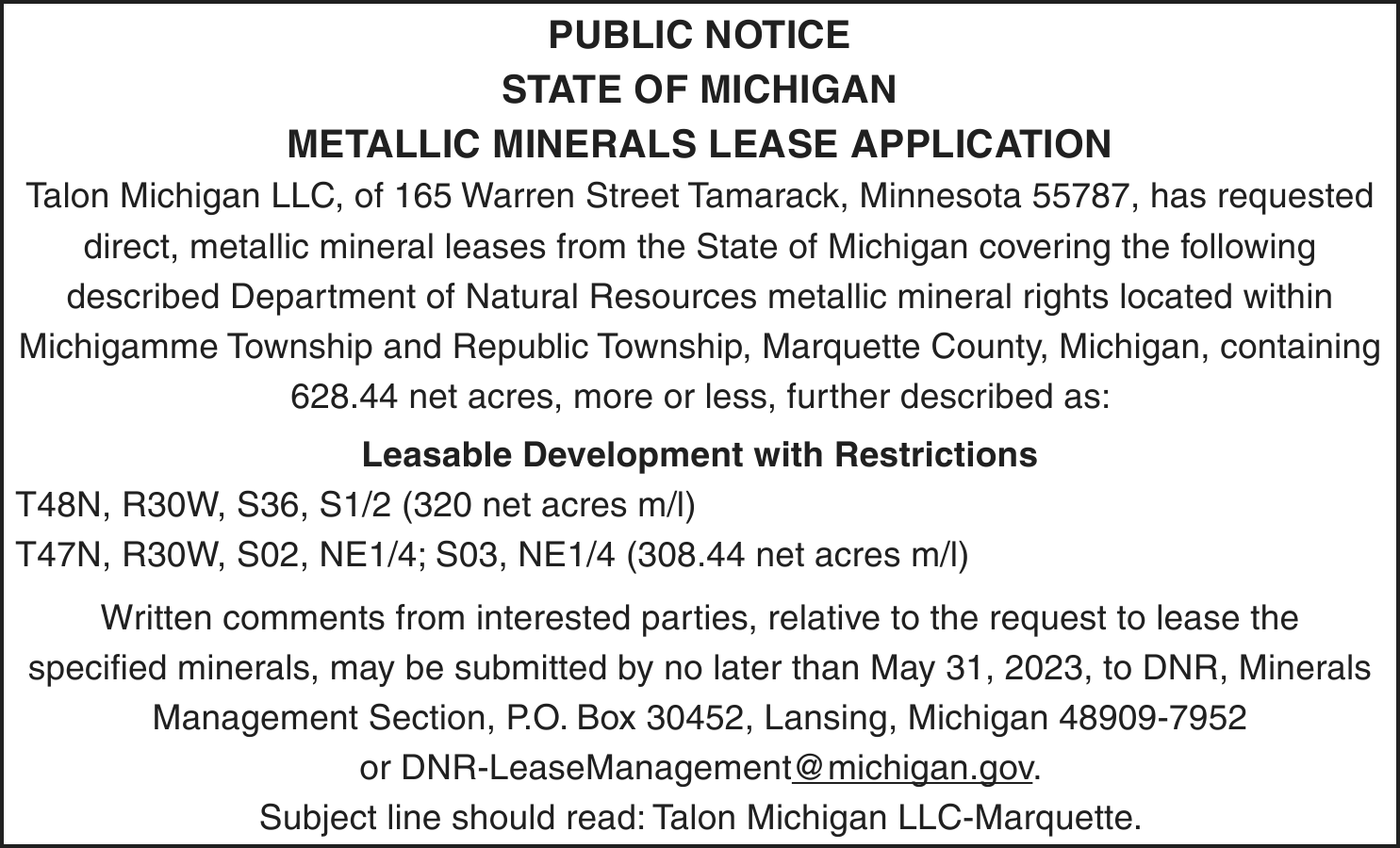 TAKE NOTICE: A hearing will be held on Monday, April 17, 2023 at 4:30pm (EST) at Marquette County Probate Court before HON. CHERYL L. HILL to change the name of: Jacob Robert Melka to Jacob Robert Pontel
