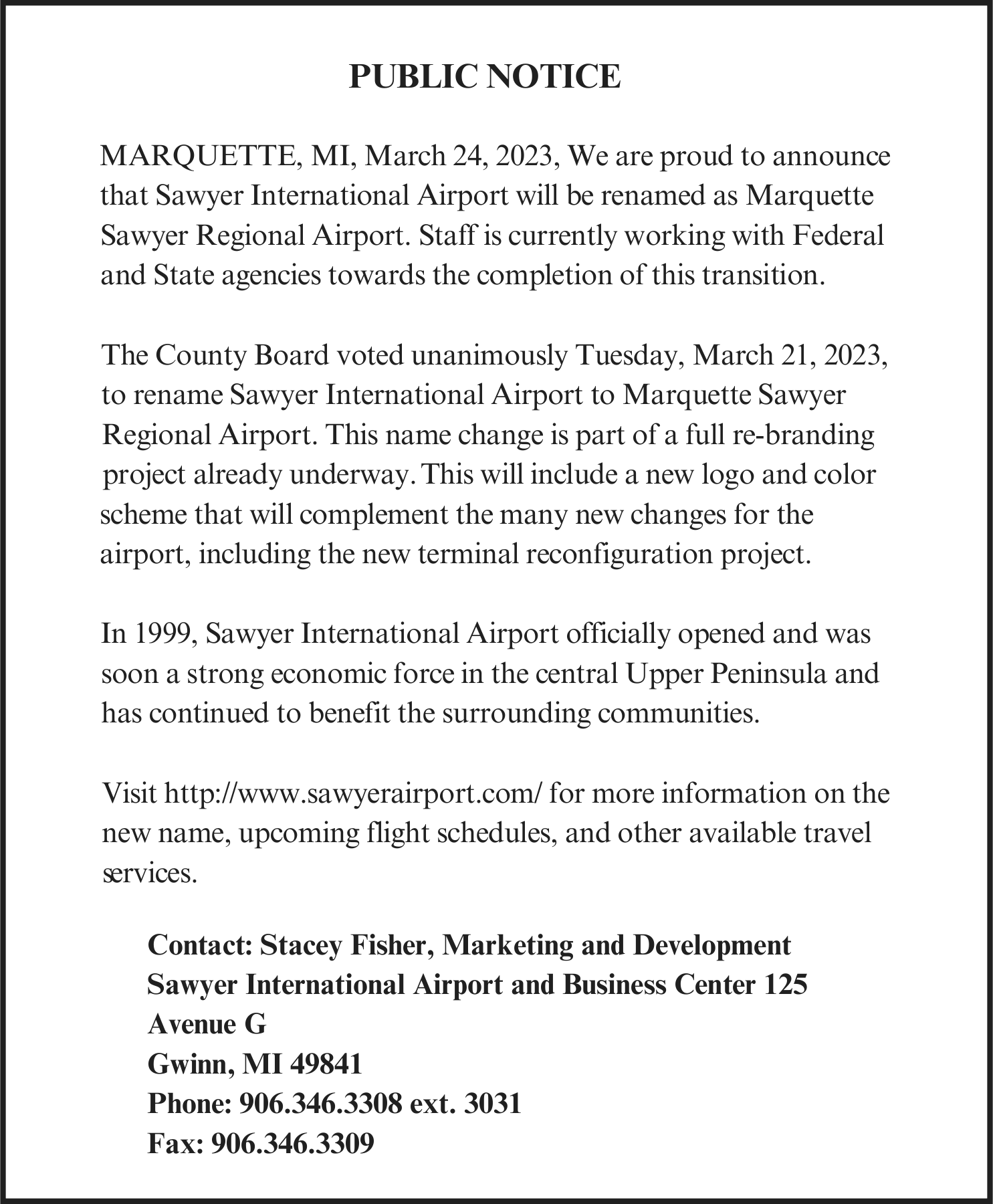 TAKE NOTICE: A hearing will be held on Monday, April 18, 2023 at 2:00pm (EST) at Marquette County Probate Court before HON. CHERYL L. HILL to change the name of:Sophia Elizabeth Portale to Saturn Elizabeth Portale