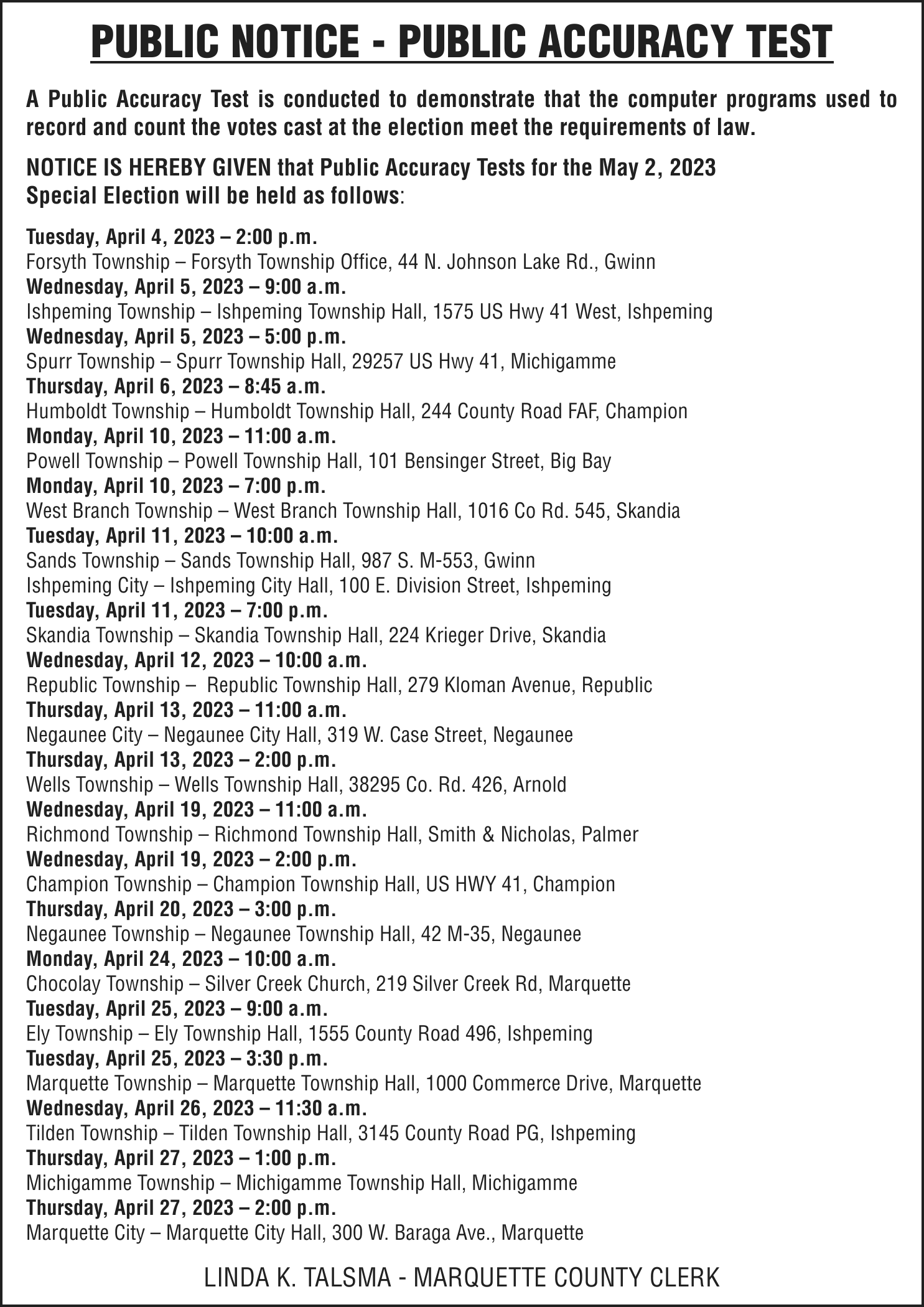 Notice is given under section 3212 of the revised judicature act of 1961, 1961 PA 236, MCL 600.3212, that the following mortgage will be foreclosed by a sale of the mortgaged premises, or some part of them, at a public auction sale to the highest bidder for cash or cashier’s check at the place of holding the circuit court in Marquette County, starting promptly at 10:00 AM, on April 13, 2023. The amount due on the mortgage may be greater on the day of sale. Placing the highest bid at the sale does not automatically entitle the purchaser to free and clear ownership of the property. A potential purchaser is encouraged to contact the county register of deeds office or a title insurance company, either of which may charge a fee for this information: