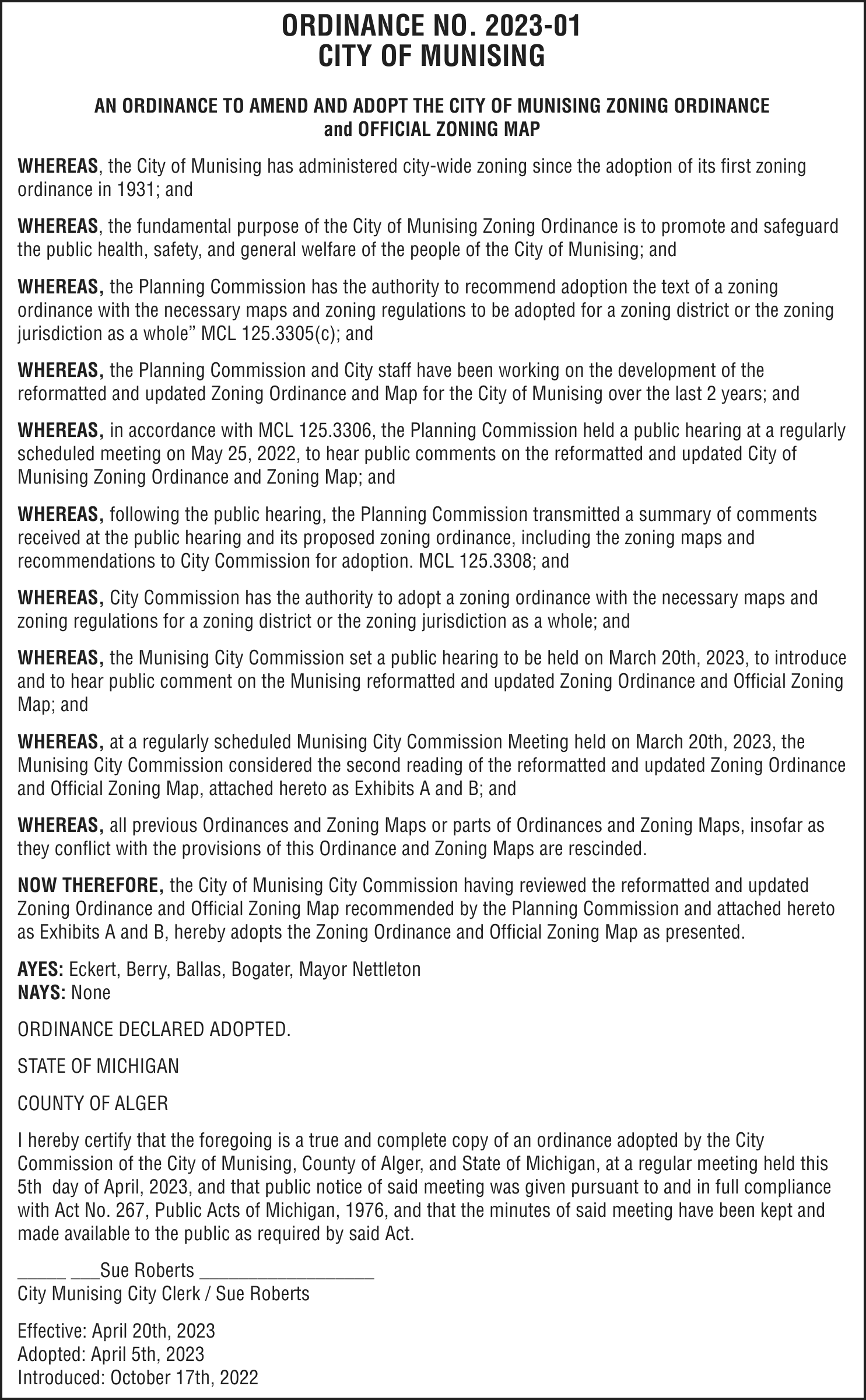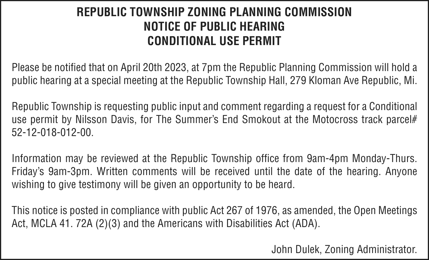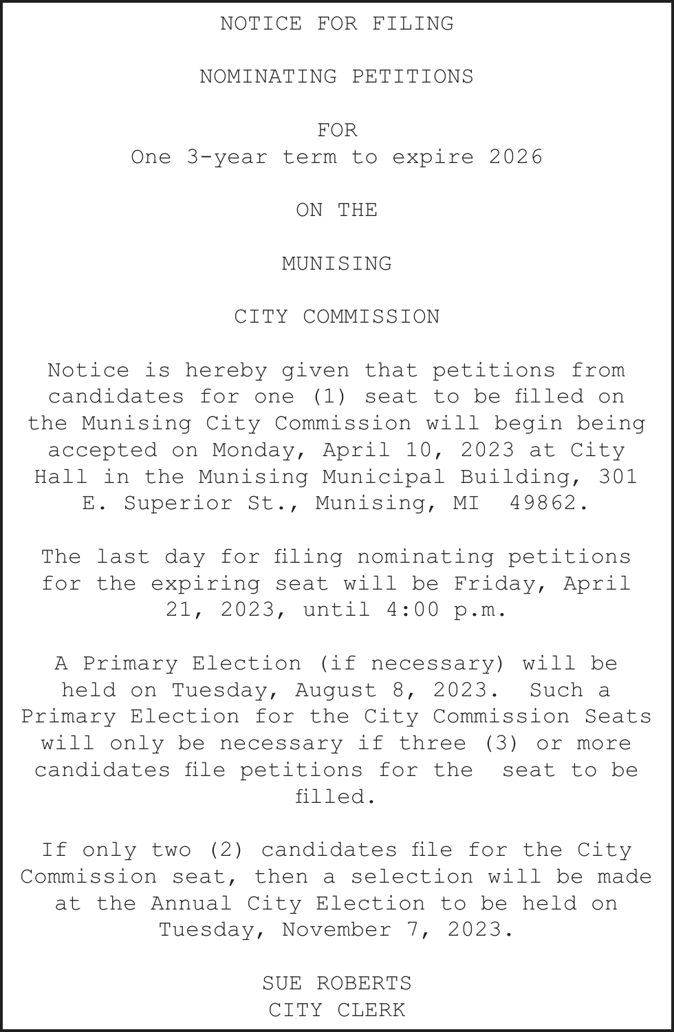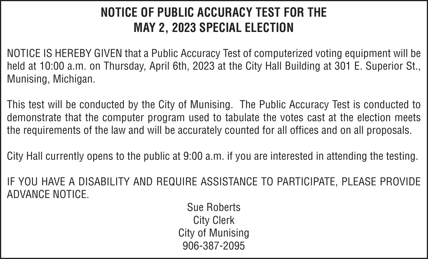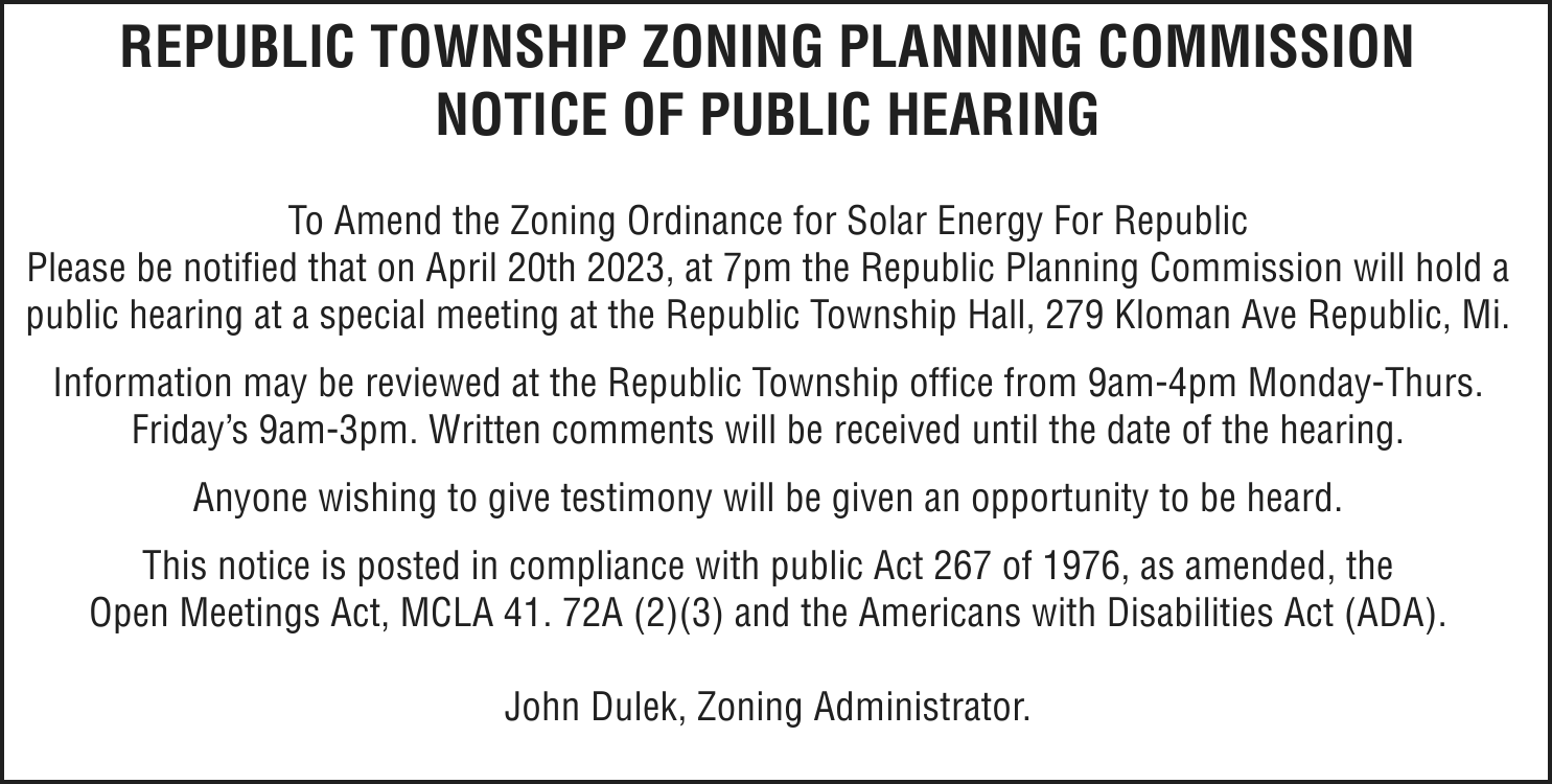TAKE NOTICE: A hearing will be held on Monday, April 17, 2023 at 11:00am at 101 Court Street, Munising, MI 49862, before Judge Charles Nebel for the following purpose: