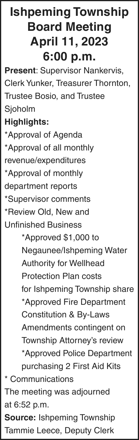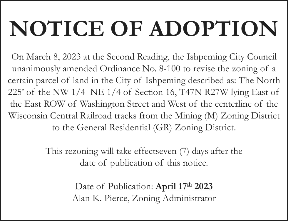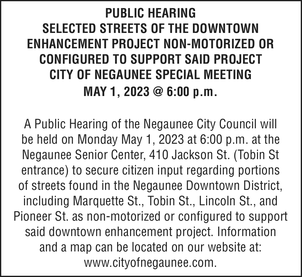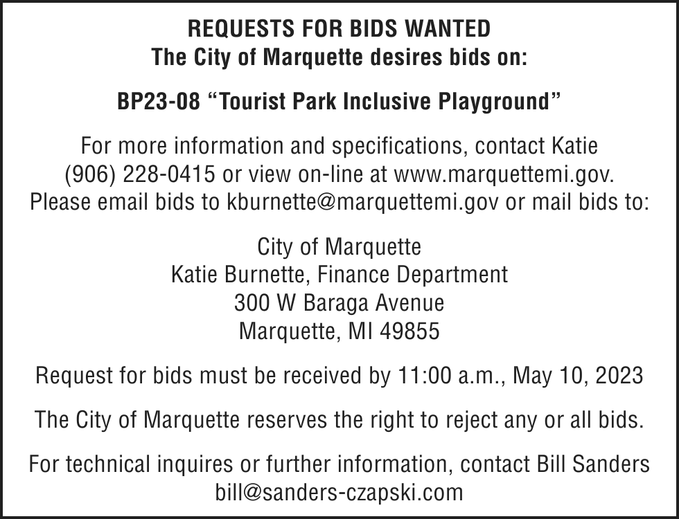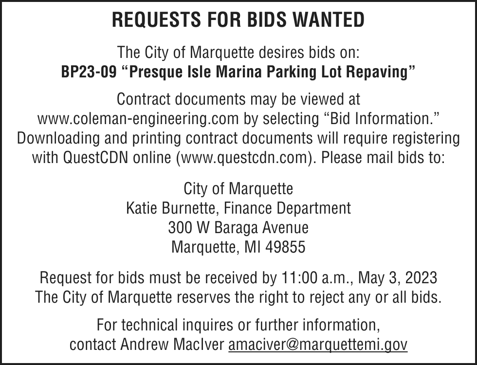 Notice of foreclosure by advertisement. Notice is given under section 3212 of the revised judicature act of 1961, 1961 PA 236, MCL 600.3212, that the following mortgage will be foreclosed by a sale of the mortgaged premises, or some part of them, at a public auction sale to the highest bidder for cash or cashier’s check at the place of holding the circuit court in Marquette County, starting promptly at 10:00 AM on MAY 4, 2023. The amount due on the mortgage may be greater on the day of the sale. Placing the highest bid at the sale does not automatically entitle the purchaser to free and clear ownership of the property. A potential purchaser is encouraged to contact the county register of deeds office or a title insurance company, either of which may charge a fee for this information.