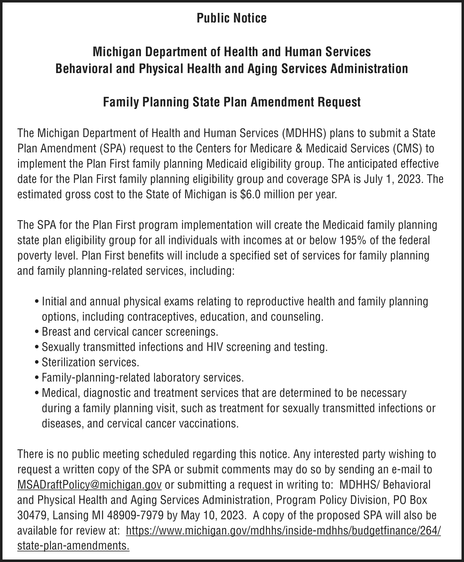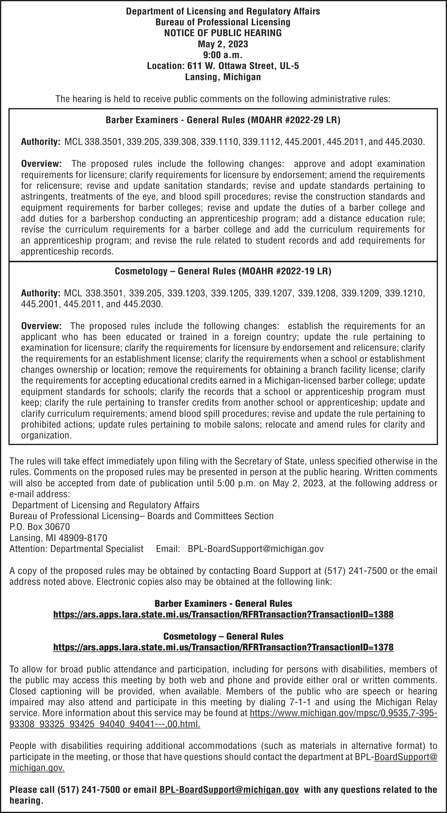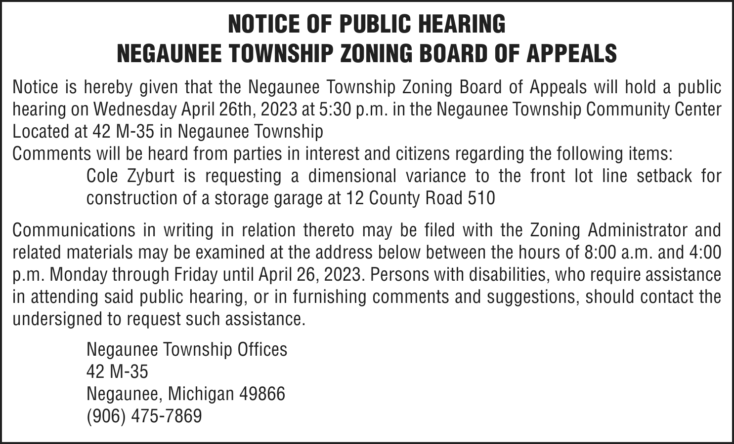 Notice of foreclosure by advertisement. Notice is given under section 3212 of the revised judicature act of 1961, 1961 PA 236, MCL 600.3212, that the following mortgage will be foreclosed by a sale of the mortgaged premises, or some part of them, at a public auction sale to the highest bidder for cash or cashier’s check at the place of holding the circuit court in Marquette County, starting promptly at 10:00 AM on MAY 4, 2023. The amount due on the mortgage may be greater on the day of the sale. Placing the highest bid at the sale does not automatically entitle the purchaser to free and clear ownership of the property. A potential purchaser is encouraged to contact the county register of deeds office or a title insurance company, either of which may charge a fee for this information.