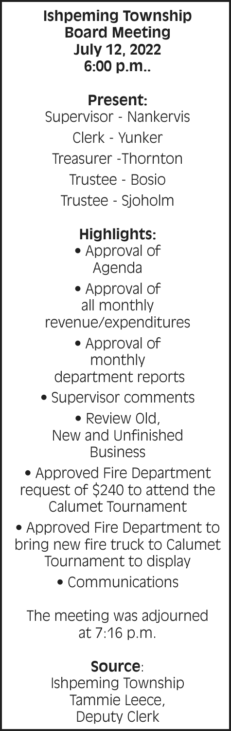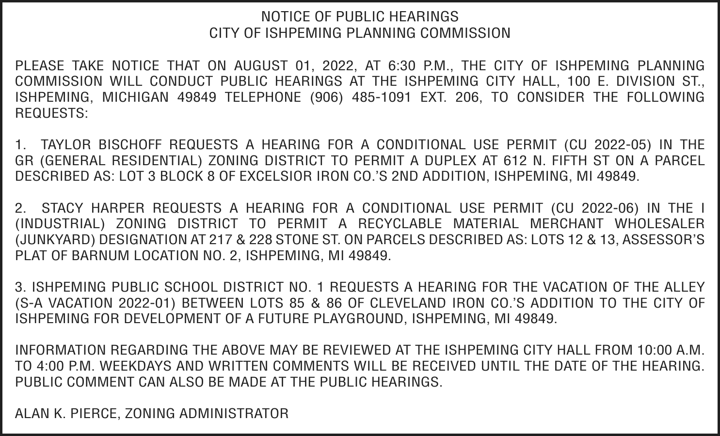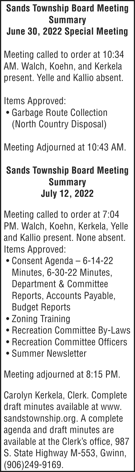 NOTICE TO CREDITORS: The decedent, Scott D. Lenten died April 13, 2022. Creditors of the decedent are notified that all claims against the estate will be forever barred unless presented to Randi Raeck, personal representative, or to both the probate court at 234 W Baraga Ave. Marquette, MI 49855.