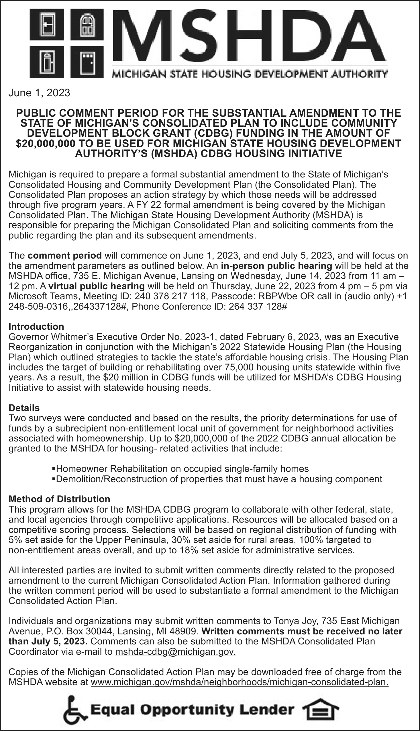Anyone needing assistance to take part in the hearing due to disability may call 517-284-7740 to make