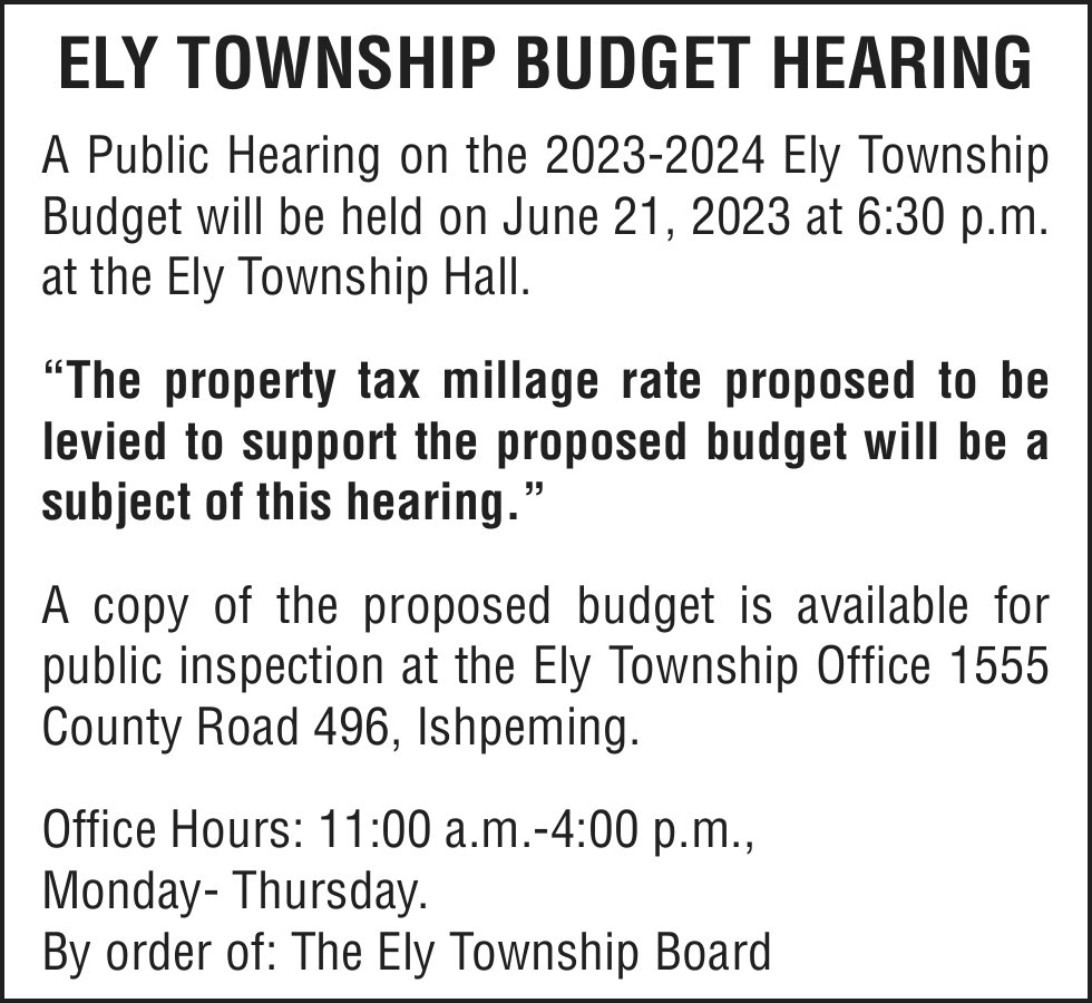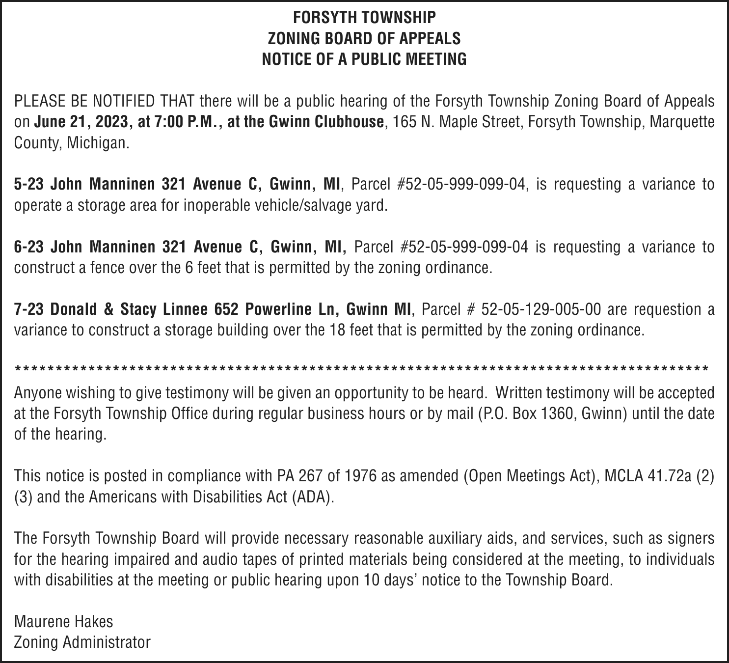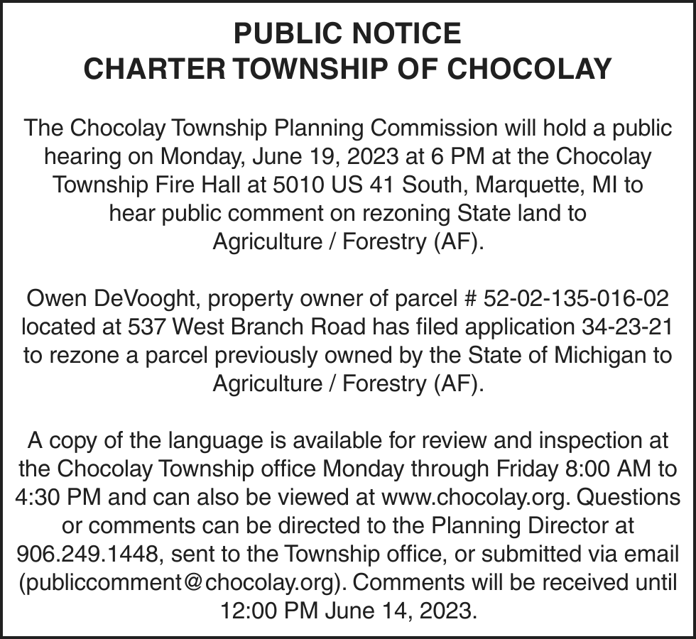 TAKE NOTICE: A hearing will be held on June 14, 2023 at 11:00am (EST) at Marquette County Probate Court before HON. CHERYL L. HILL to change the name of: Lucian Sky Donaldson to Lucian Sky Fox and Ari Alexander Donaldson to Ari Alexander Fox