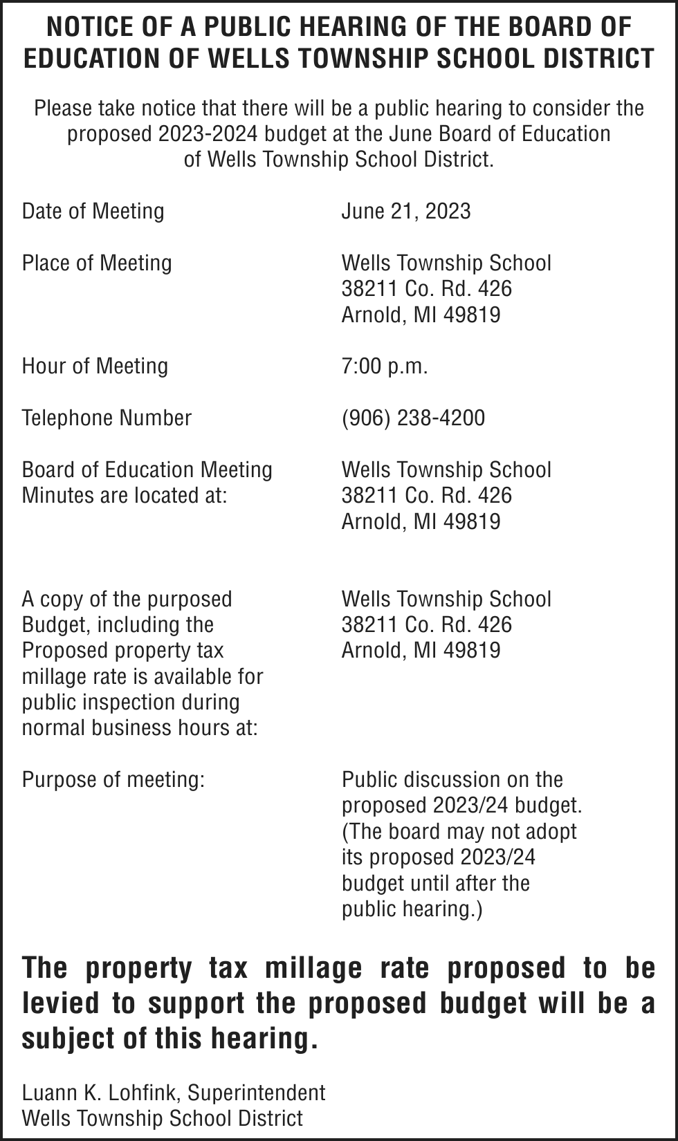 TAKE NOTICE: A hearing will be held on Monday, July 24th, 2023 at 9:00am (EST) at Marquette County Probate Court before HON. CHERYL L. HILL to change the name of: Abigail Elizabeth Brogan to Benny Elliot Brogan
