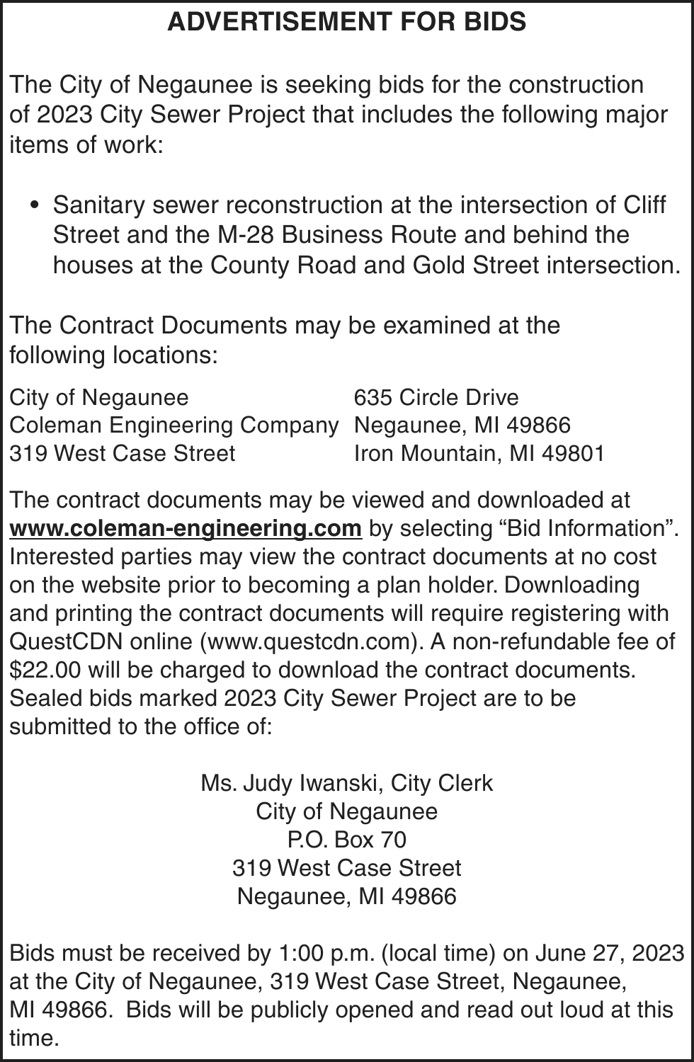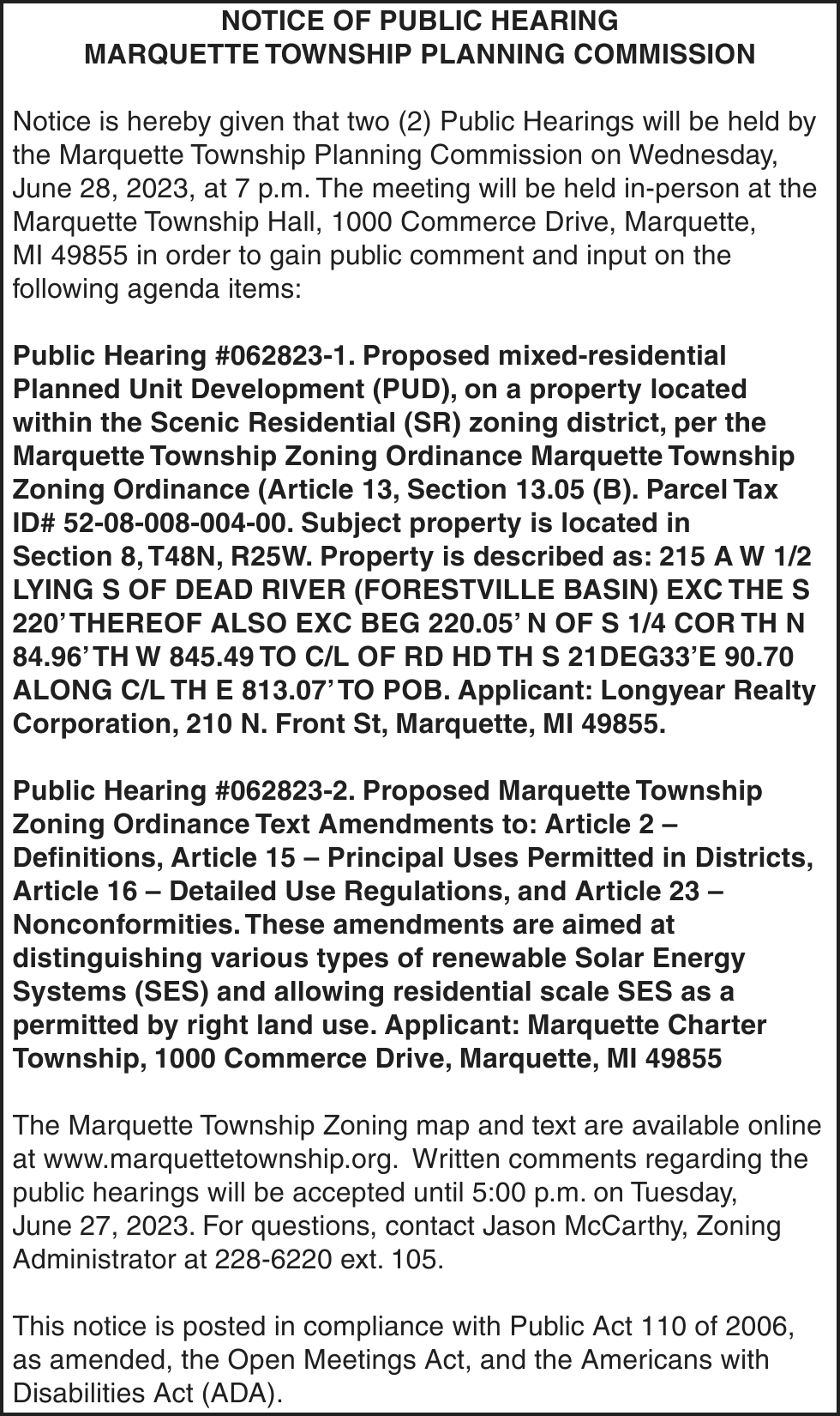 Notice of foreclosure by advertisement. Notice is given under section 3212 of the revised judicature act of 1961, 1961 PA 236, MCL 600.3212, that the following mortgage will be foreclosed by a sale of the mortgaged premises, or some part of them, at a public auction sale to the highest bidder for cash or cashier’s check at the place of holding the circuit court in Marquette County, starting promptly at 10:00 AM on JUNE 22, 2023. The amount due on the mortgage may be greater on the day of the sale. Placing the highest bid at the sale does not automatically entitle the purchaser to free and clear ownership of the property. A potential purchaser is encouraged to contact the county register of deeds office or a title insurance company, either of which may charge a fee for this information.
