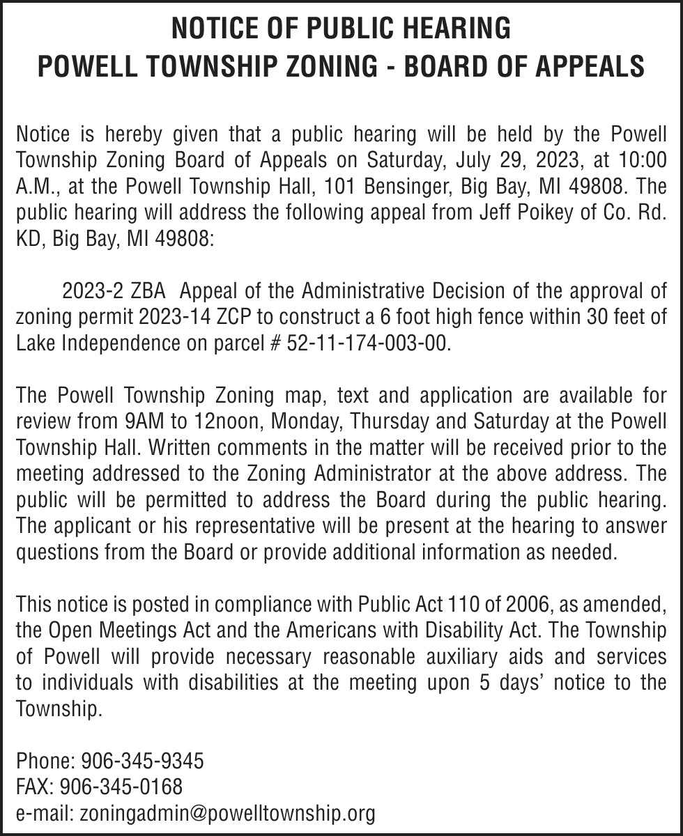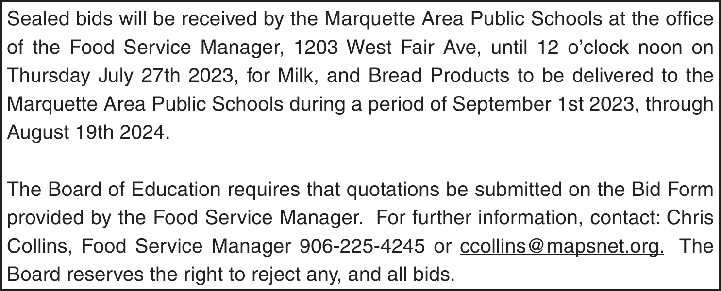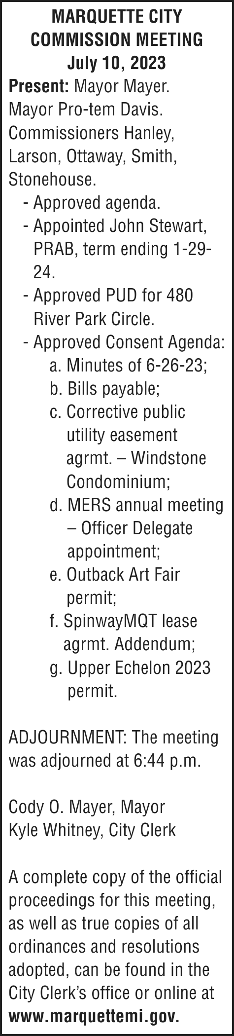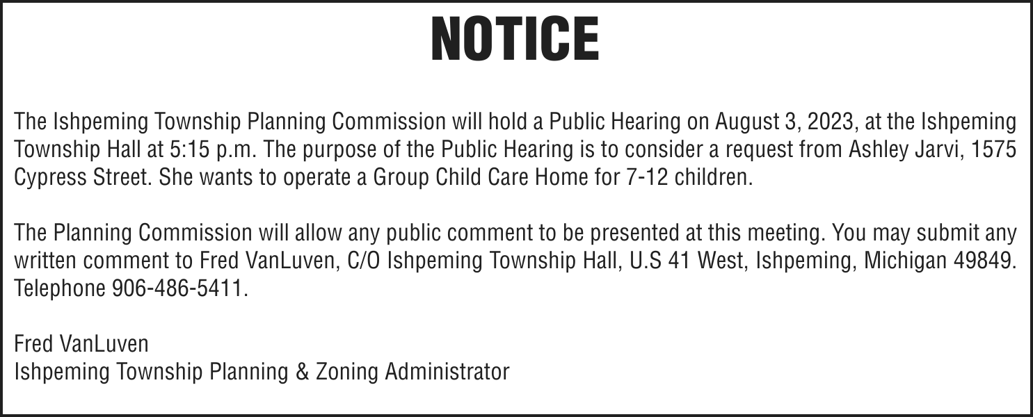 Marquette County will conduct a public hearing on July 18, 2023 at 6:00 PM at Room 231 of the Courthouse Annex, 234 W. Baraga Ave, for the purpose of affording citizens an opportunity to examine and submit comments on the proposed application for a CDBG grant.