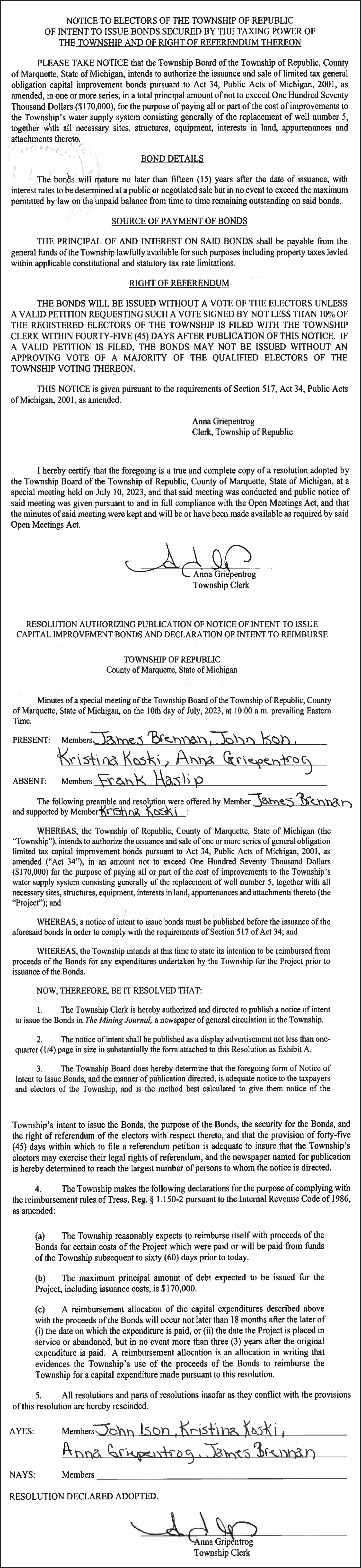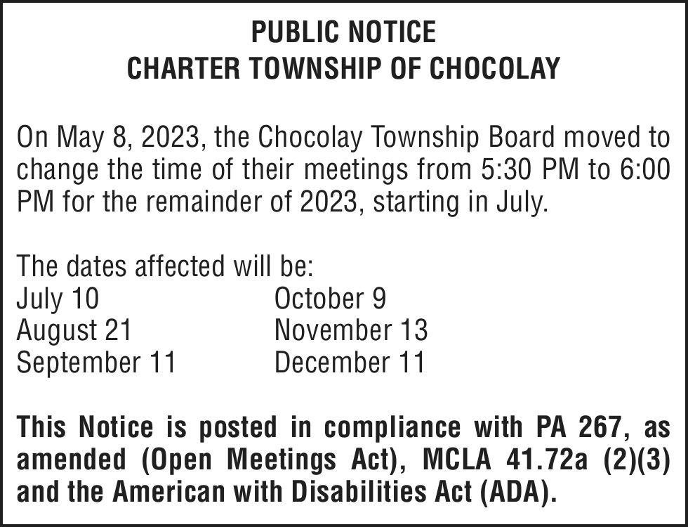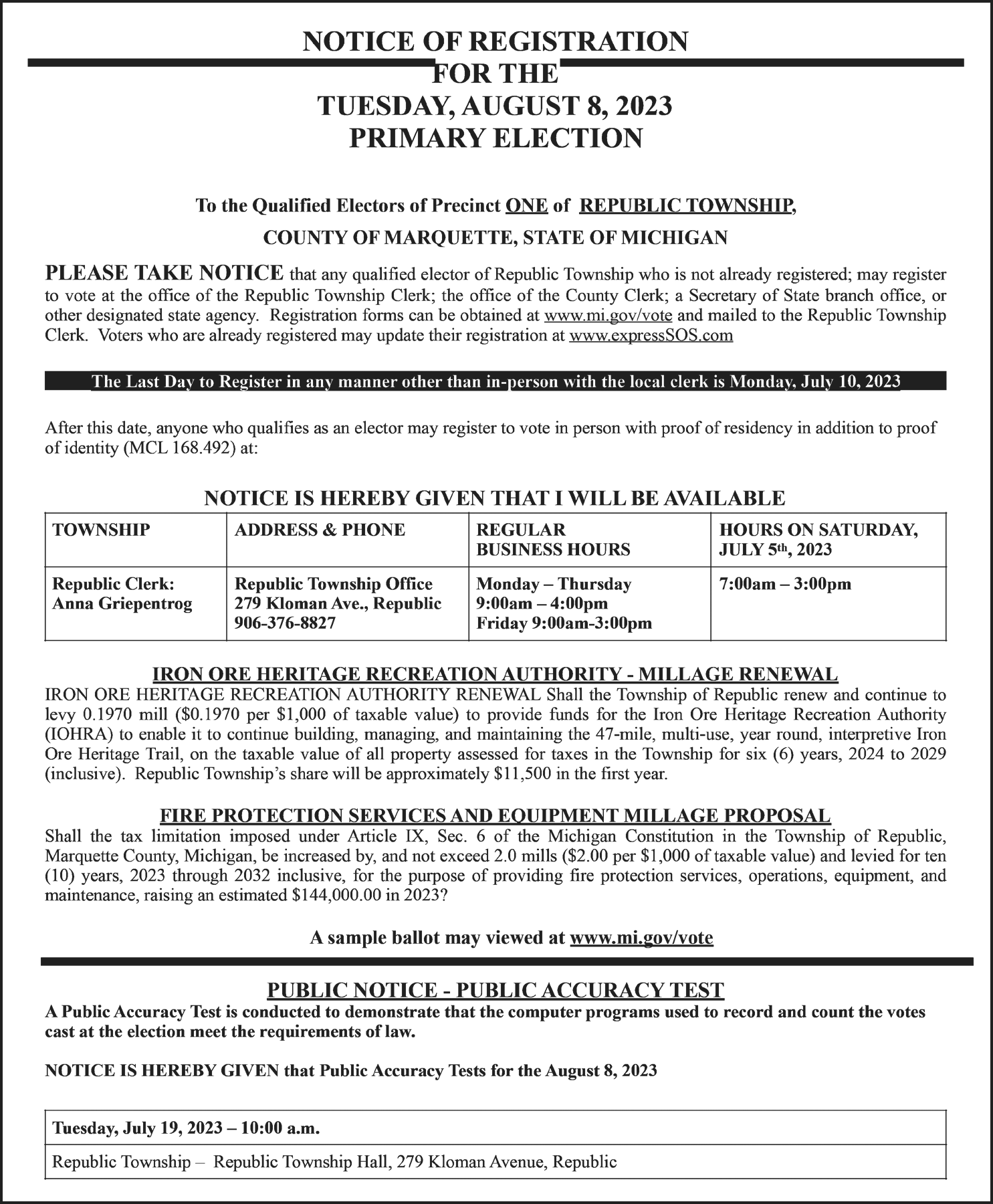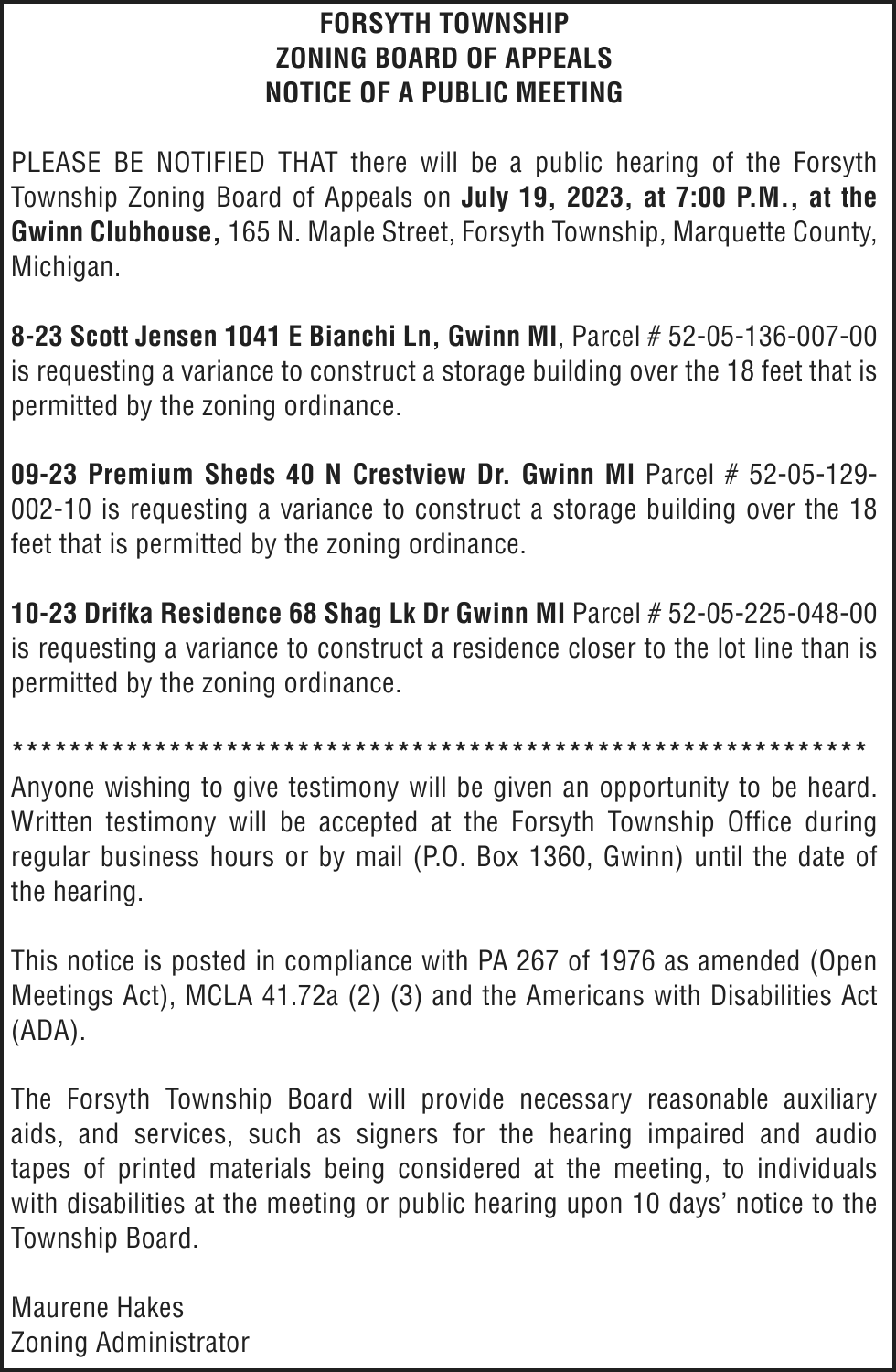 Marquette County will conduct a public hearing on July 18, 2023 at 6:00 PM at Room 231 of the Courthouse Annex, 234 W. Baraga Ave, for the purpose of affording citizens an opportunity to examine and submit comments on the proposed application for a CDBG grant.