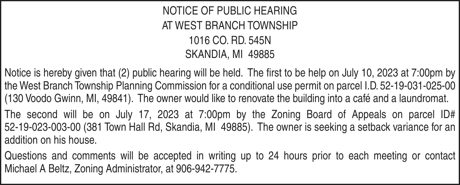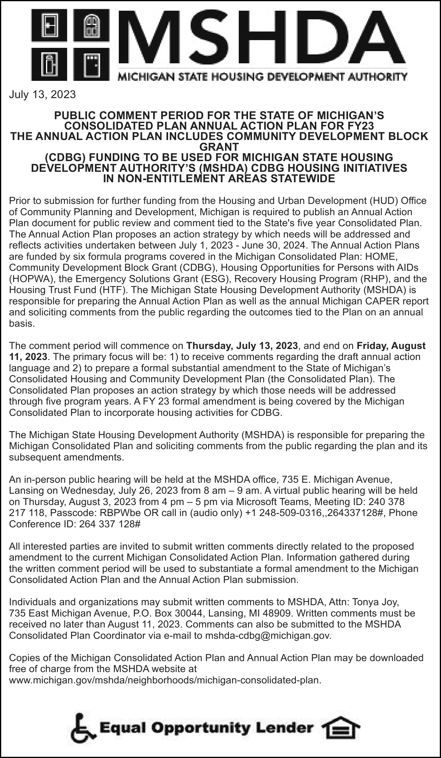 Further information is available for review. Please contact Emily Leach, Senior Planner, (906-225-8196) or view program information at housing.mqtco.org. Comments may be submitted in writing through (July 17, 2023) or made in person at the public hearing.