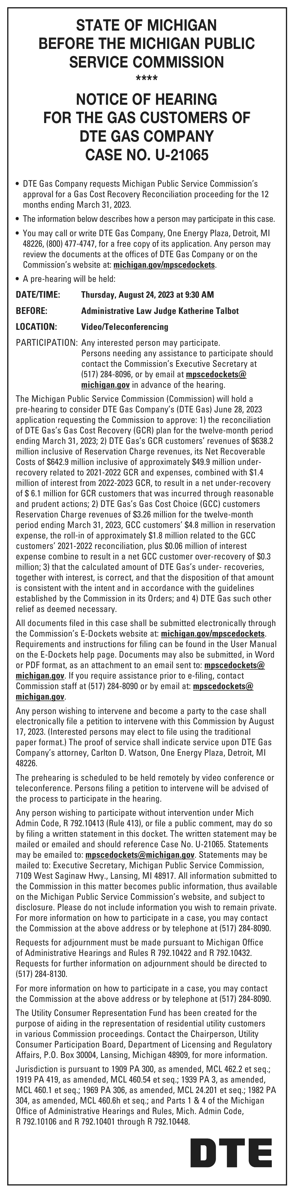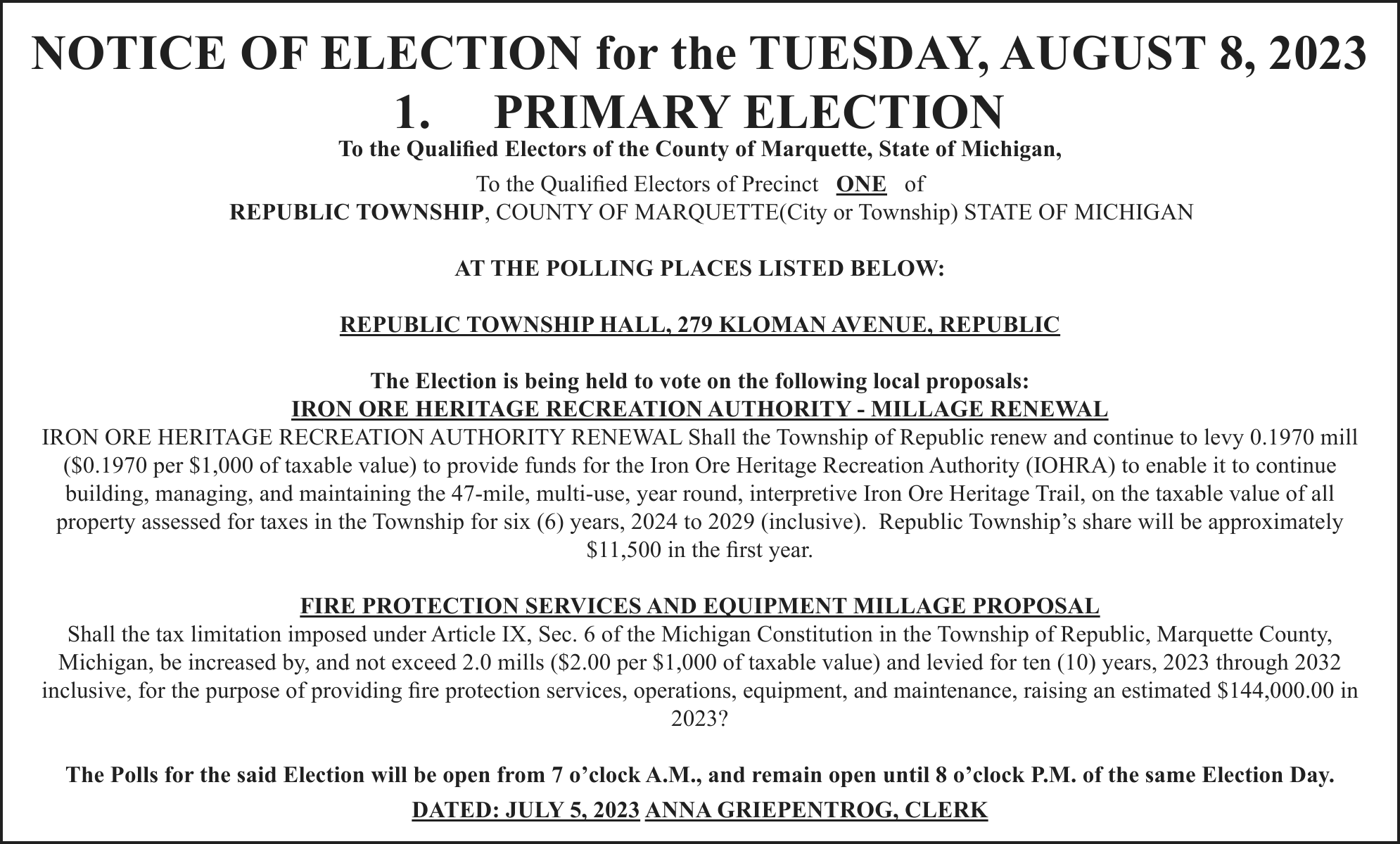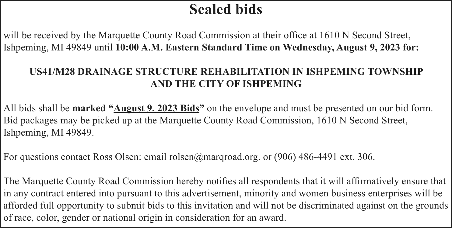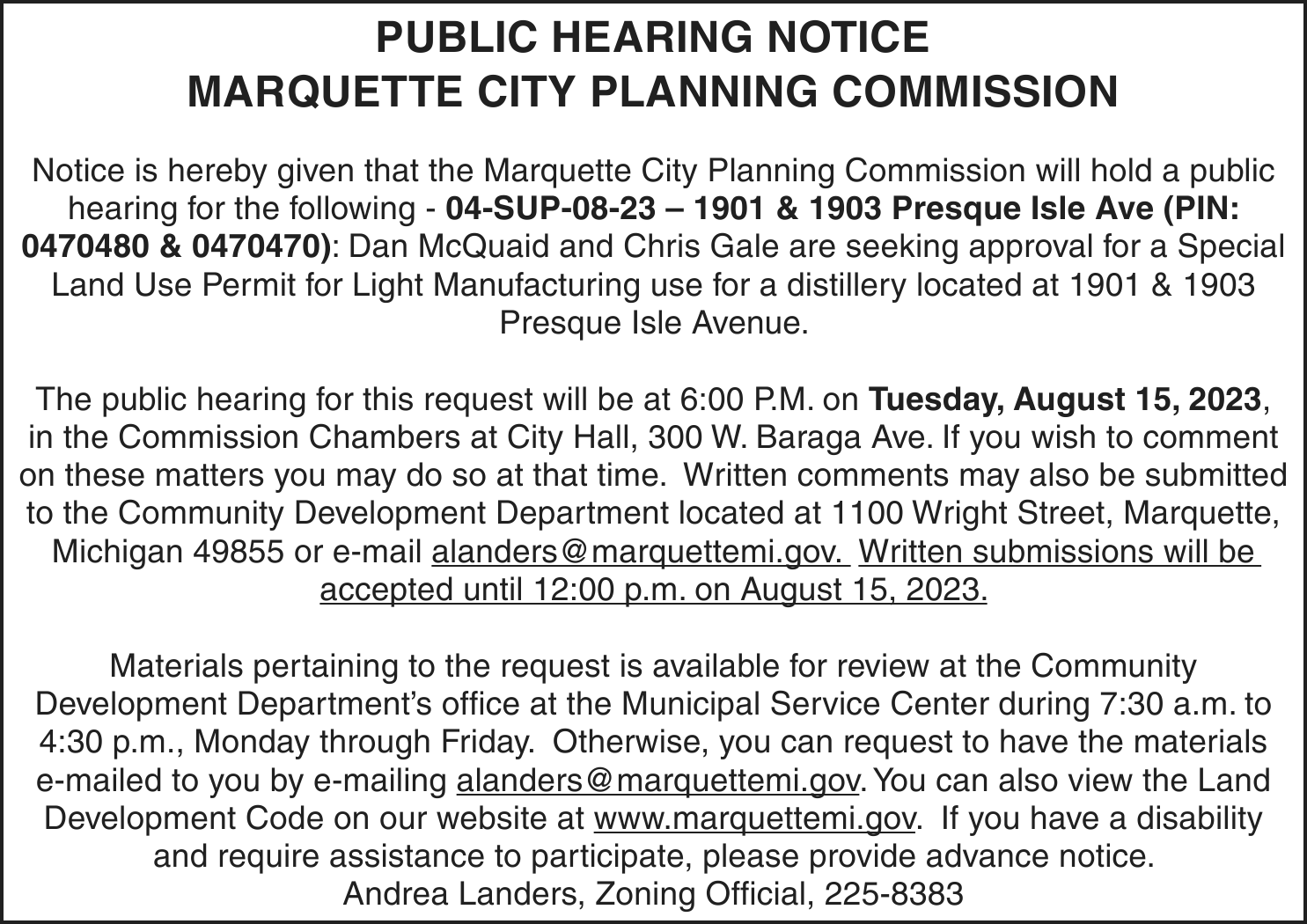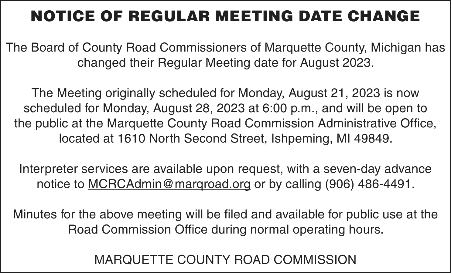 A name change hearing will be held on Friday, Aug. 11, 2023 at 1:30pm (EST) at Marquette County Probate Court before HON. CHERYL L. HILL to change the name of: Kyleigh Marie Hebert to Kyleigh Marie Chartre