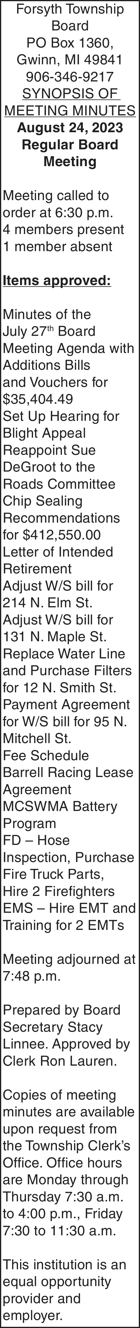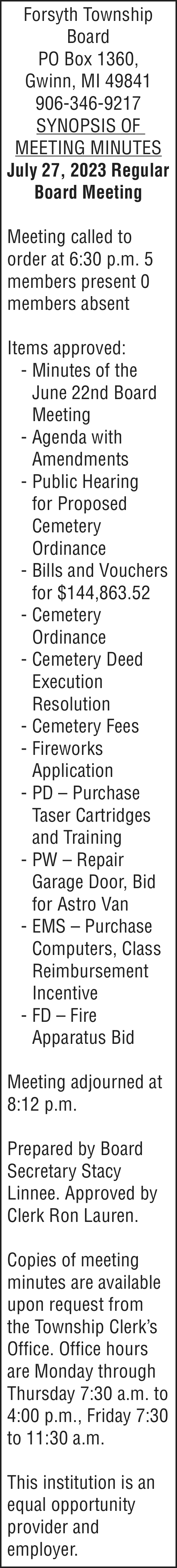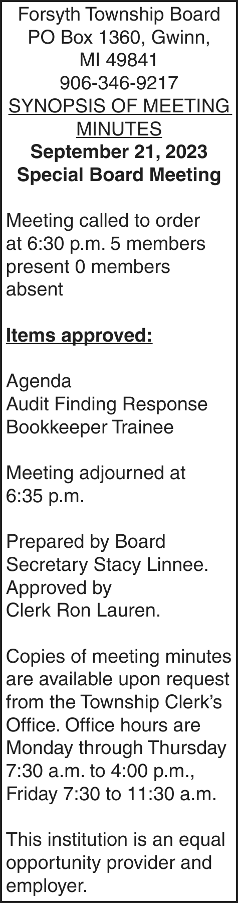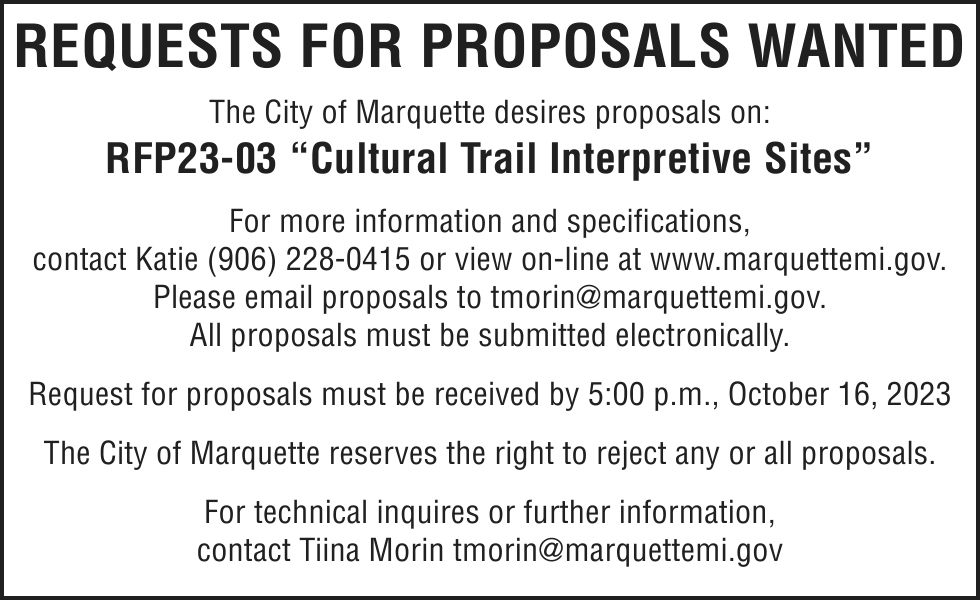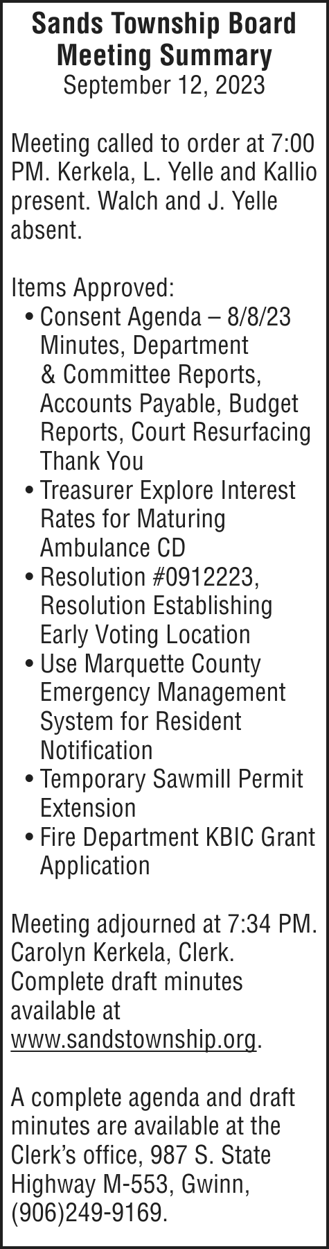 NOTICE TO CREDITORS: The decedent, Annette L. Larson, who lived at Teal Lake Assisted Living, 290 W. Water St, Negaunee, Michigan 49866, died on August 30, 2023. Creditors of the decedent are notified that all claims against the trust will be forever barred unless presented to Debra S. Larson, Trustee, at 11909 Minnetonka Blvd. Minnetonka, MN 55305 within four (4) months after the date of this notice. Notice is further given that the trust will be thereafter assigned and distributed to the persons entitled to it.