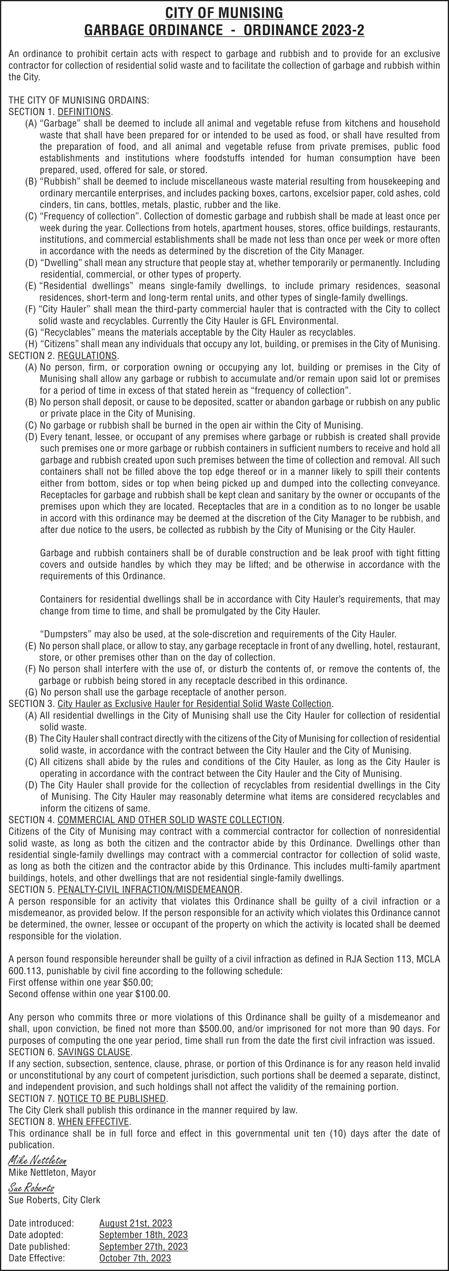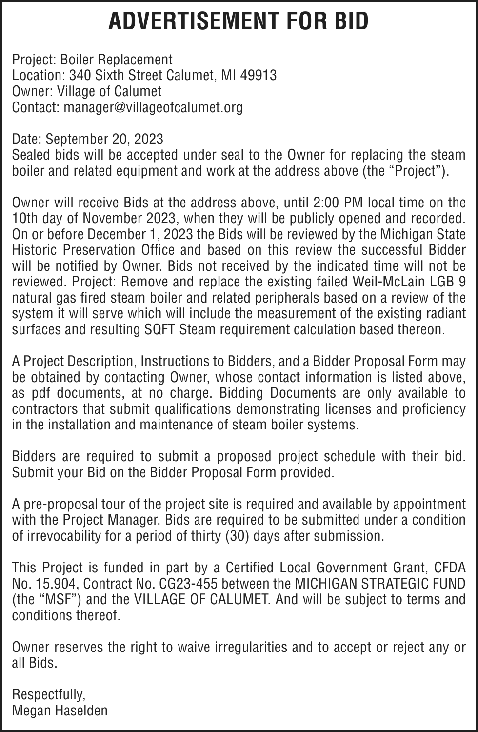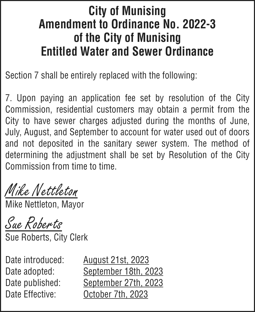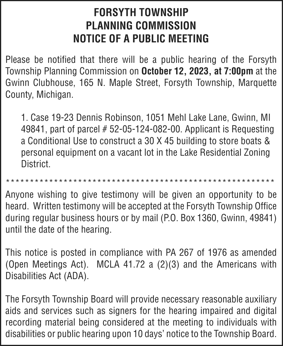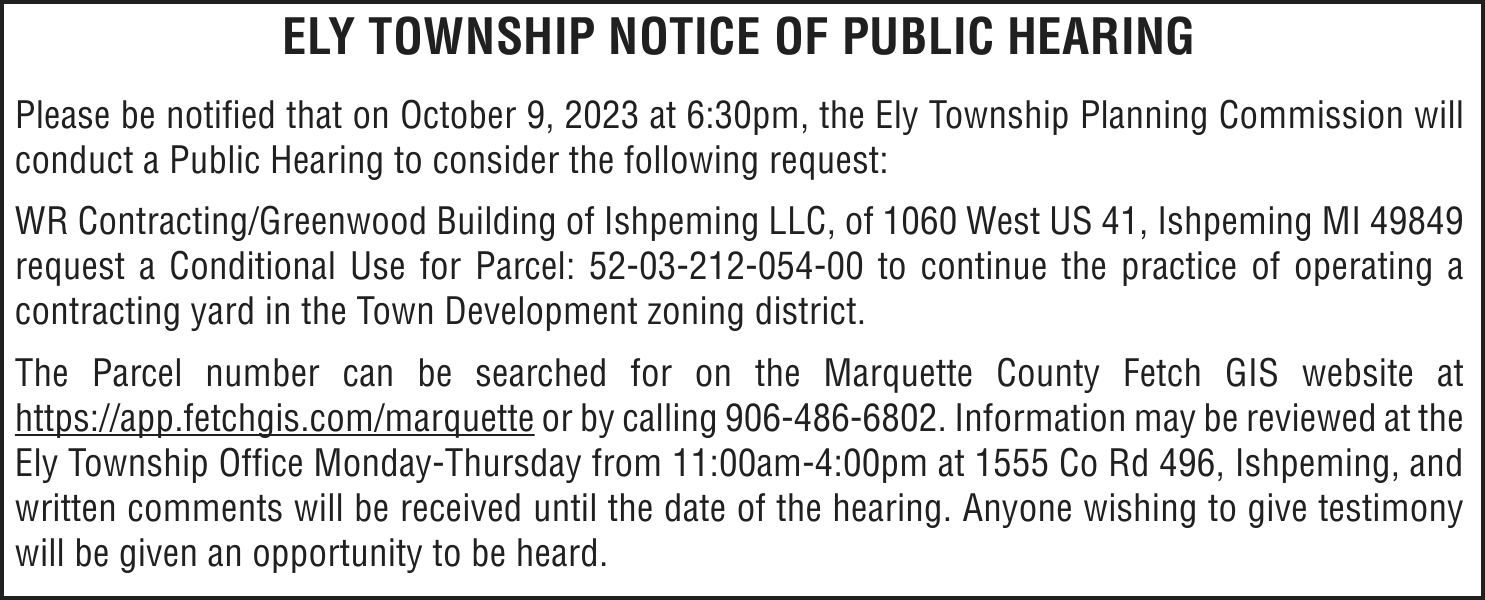 TAKE NOTICE: A hearing will be held on Tuesday, October 17, 2023 at 9:00am (EST) at Marquette County Probate Court before HON. CHERYL L. HILL to change the name of: Tara Anne Mankee to Miles Flynn Mankee