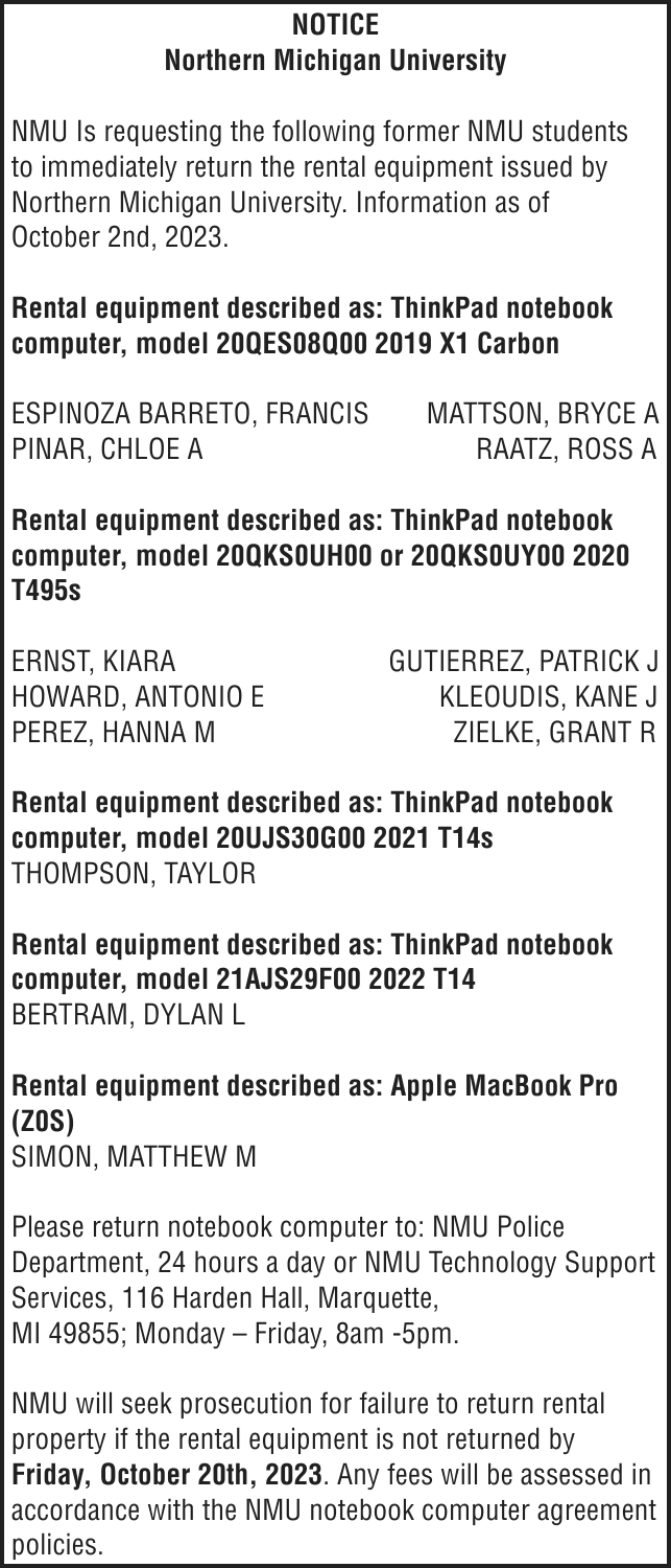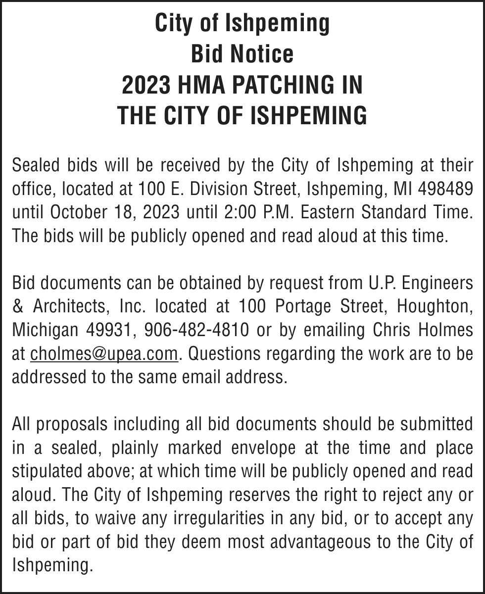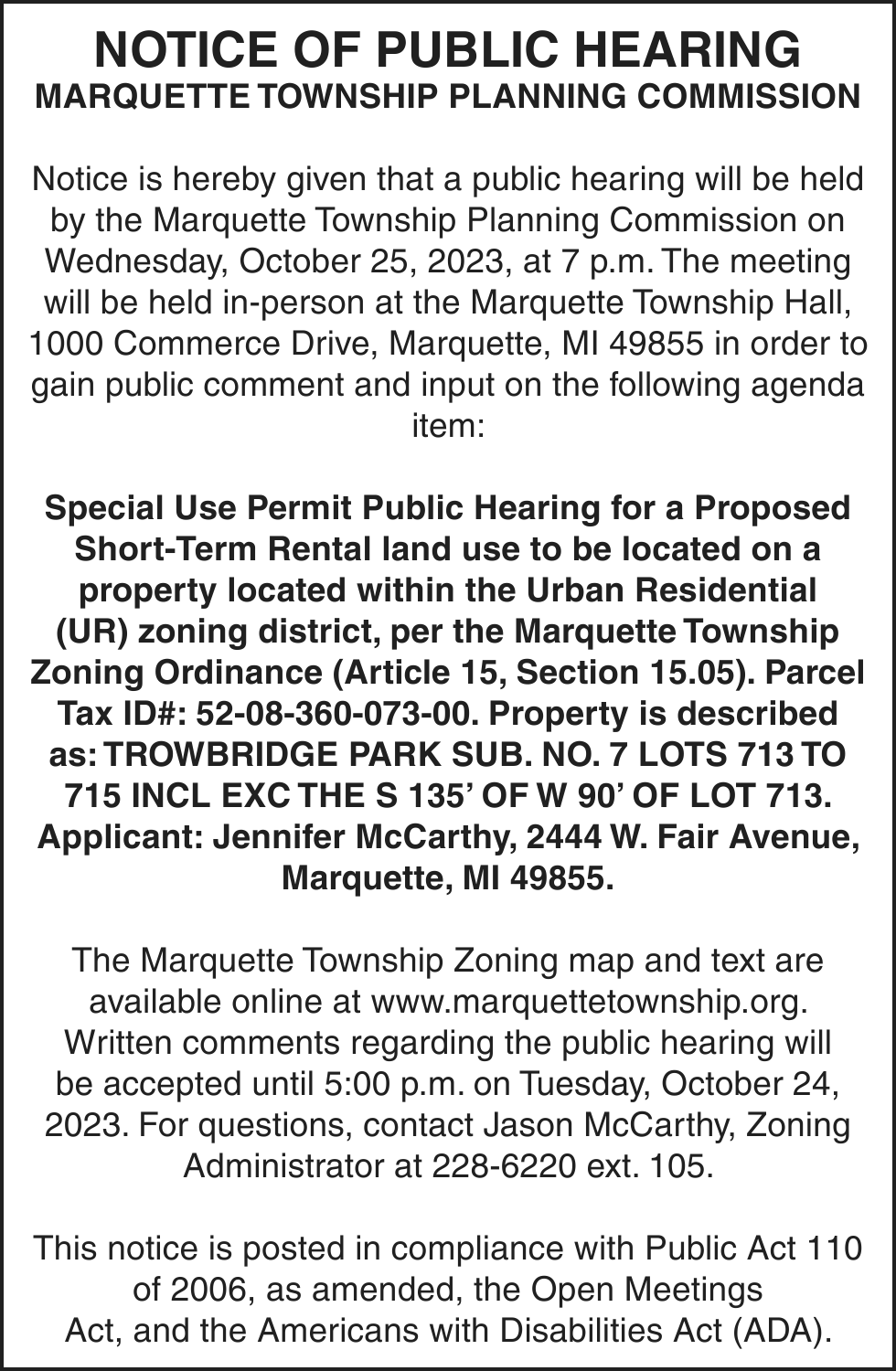 Notice is given under section 3212 of the revised judicature act of 1961, 1961 PA 236, MCL 600.3212, that the following mortgage will be foreclosed by a sale of the mortgaged premises, or some part of them, at a public auction sale to the highest bidder for cash or cashier’s check at the place of holding the circuit court in Marquette County, starting promptly at 10:00 AM, on October 12, 2023. The amount due on the mortgage may be greater on the day of sale. Placing the highest bid at the sale does not automatically entitle the purchaser to free and clear ownership of the property. A potential purchaser is encouraged to contact the county register of deeds office or a title insurance company, either of which may charge a fee for this information: