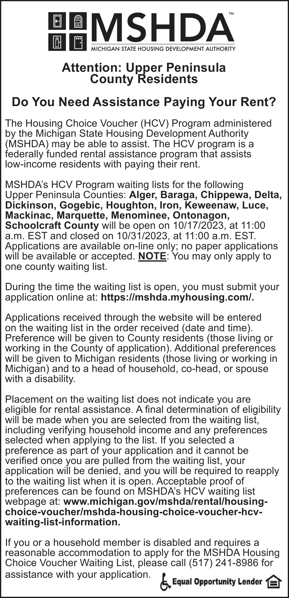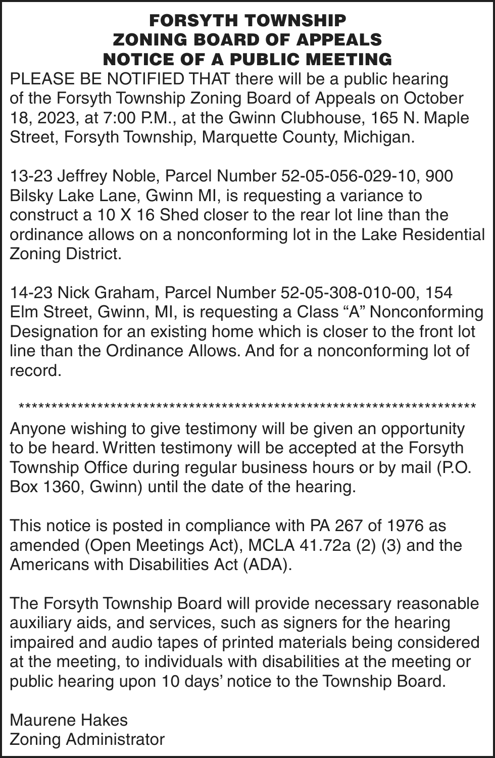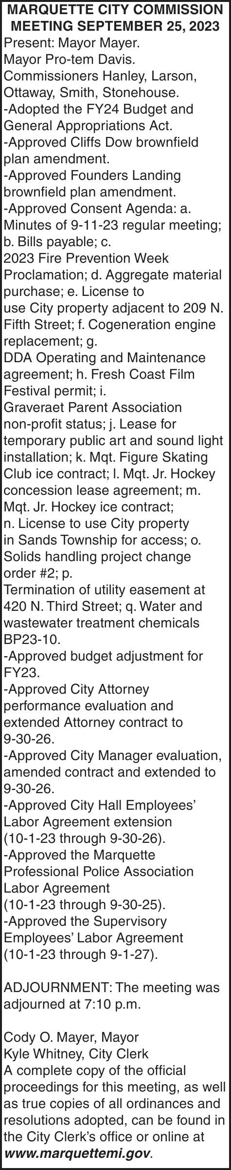 Notice is given under section 3212 of the revised judicature act of 1961, 1961 PA 236, MCL 600.3212, that the following mortgage will be foreclosed by a sale of the mortgaged premises, or some part of them, at a public auction sale to the highest bidder for cash or cashier’s check at the place of holding the circuit court in Marquette County, starting promptly at 10:00 AM, on October 12, 2023. The amount due on the mortgage may be greater on the day of sale. Placing the highest bid at the sale does not automatically entitle the purchaser to free and clear ownership of the property. A potential purchaser is encouraged to contact the county register of deeds office or a title insurance company, either of which may charge a fee for this information:
