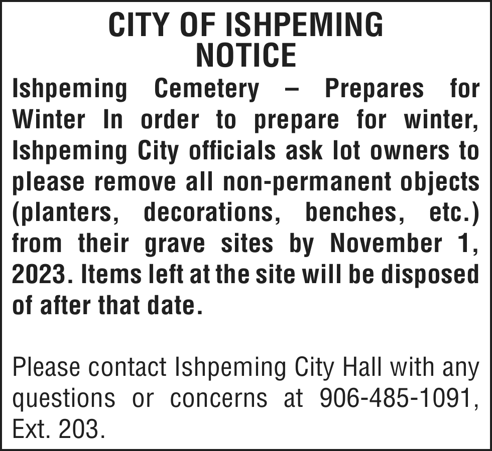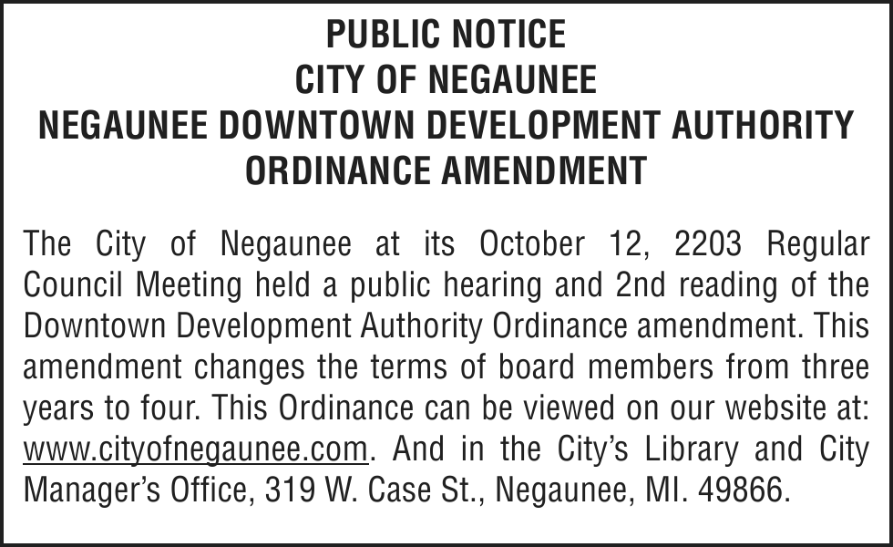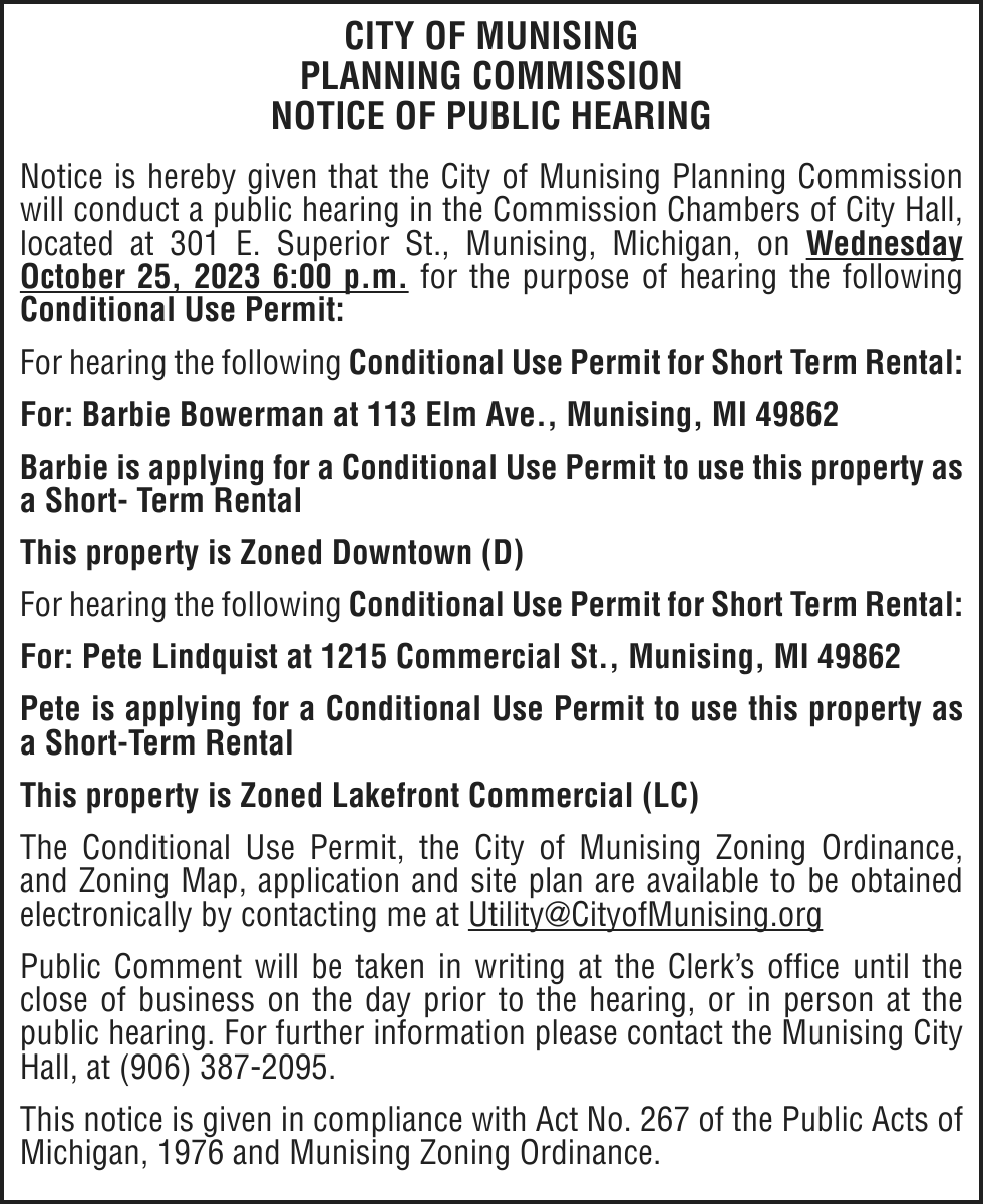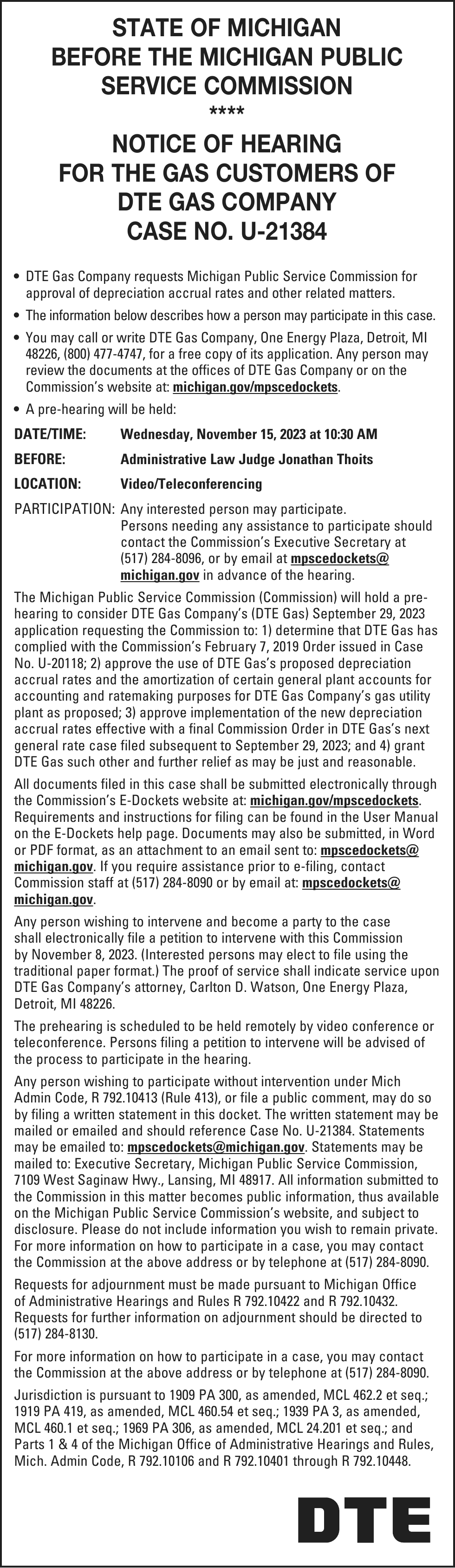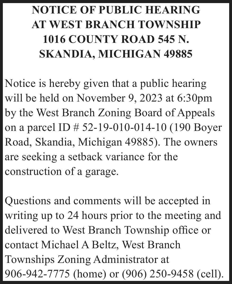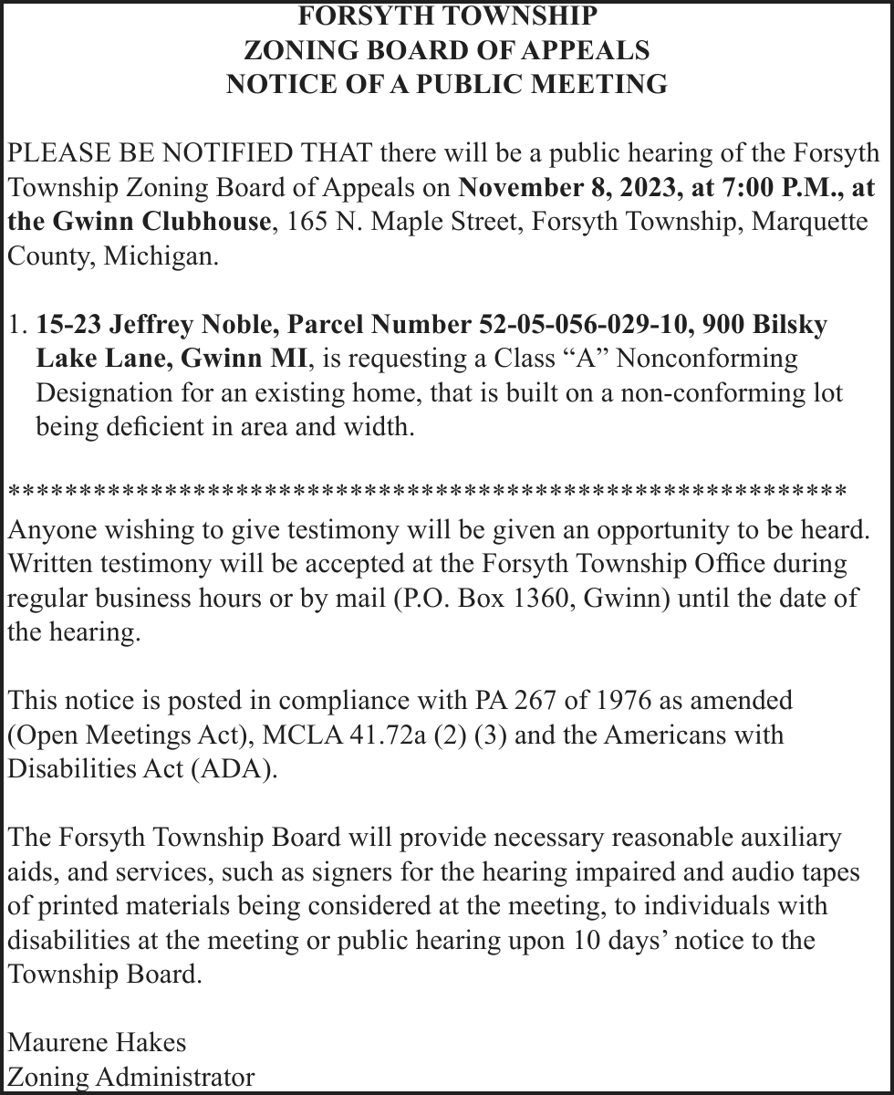 TAKE NOTICE: A hearing will be held on November 13, 2023 at 1:15 CST at 705 S. Stephenson Ave., Iron Mountain, MI before Judge Thomas Slagle P43334 for the following purpose: