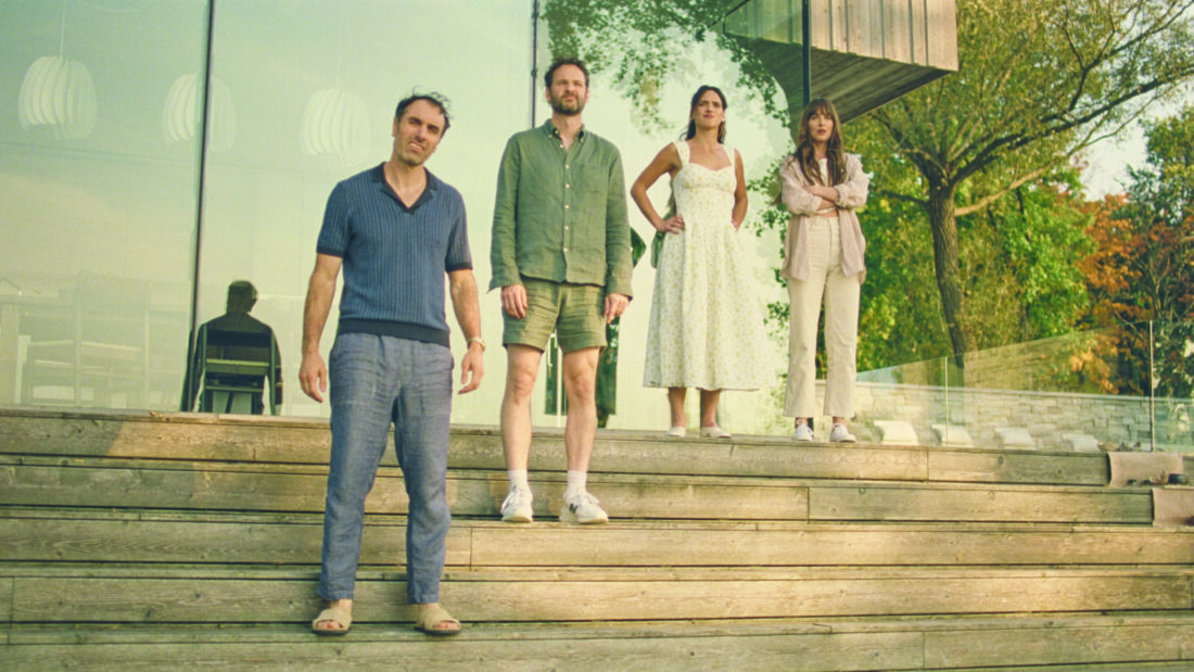 - This image released by Neon shows, from left, Michael Angelo Covino, Kyle Marvin, Adria Arjona, and Dakota Johnson in a scene from “Splitsville.” (Neon via AP)