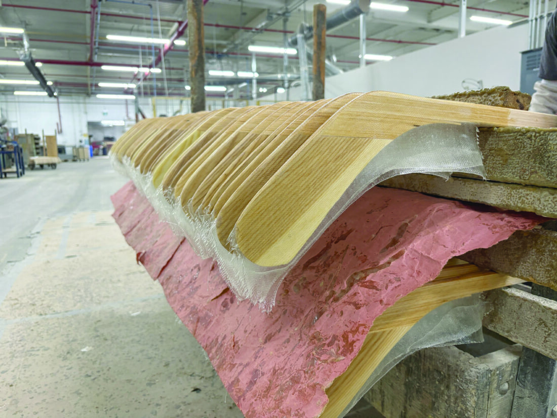 At one workstation, a worker uses liquid epoxy to glue fiberglass reinforcing sheets to wooden blades, in batches of six. Nearby, another worker uses a band saw to trim dried excess fiberglass off each blade. In the paint room, sticks are dipped in white paint and then hung on a line of moving hooks to dry.