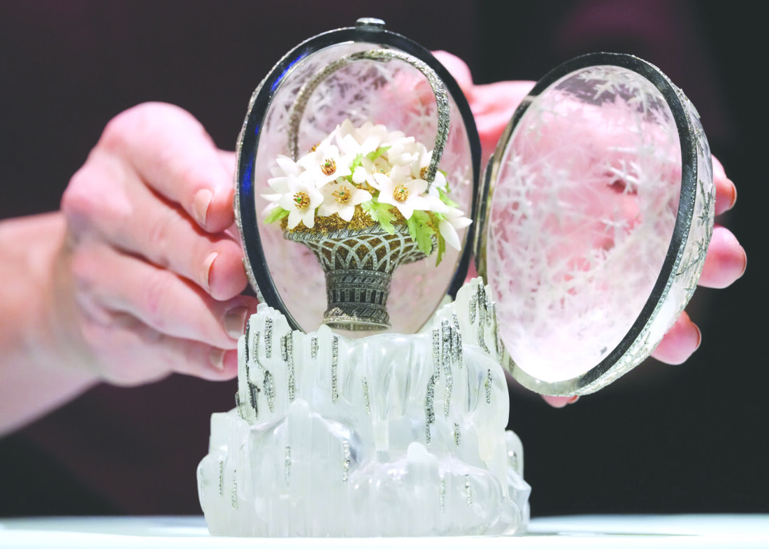 The Winter Egg by Faberge is displayed at Christie's auction rooms in London on Thursday. It is expected to sell for in excess of 20 million UK pounds when it is auctioned on Sunday. (AP photo)