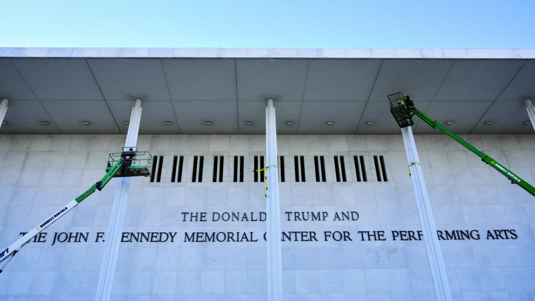New signage, The Donald J. Trump and The John F. Kennedy Memorial Center For The Performing Arts, is unveiled on the Kennedy Center on Dec. 19 in Washington. (AP photo)