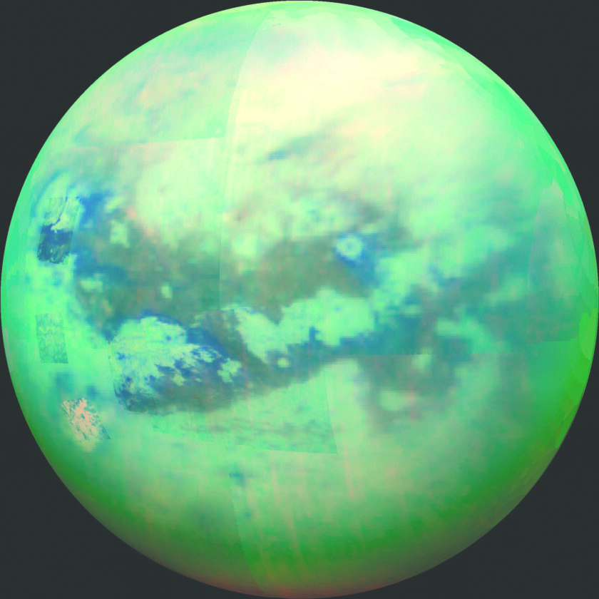 This November 2015 composite image made available by NASA shows an infrared view of Saturn's moon, Titan, as seen by the Cassini spacecraft. (NASA/JPL/ESA/Italian Space Agency via AP)