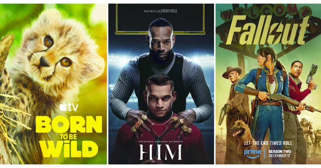 This combination of photos shows promotional art for the nature documentary series "Born to Be Wild," left, the film "Him," and the series "Fallout." (Apple TV/Universal/Prime via AP)