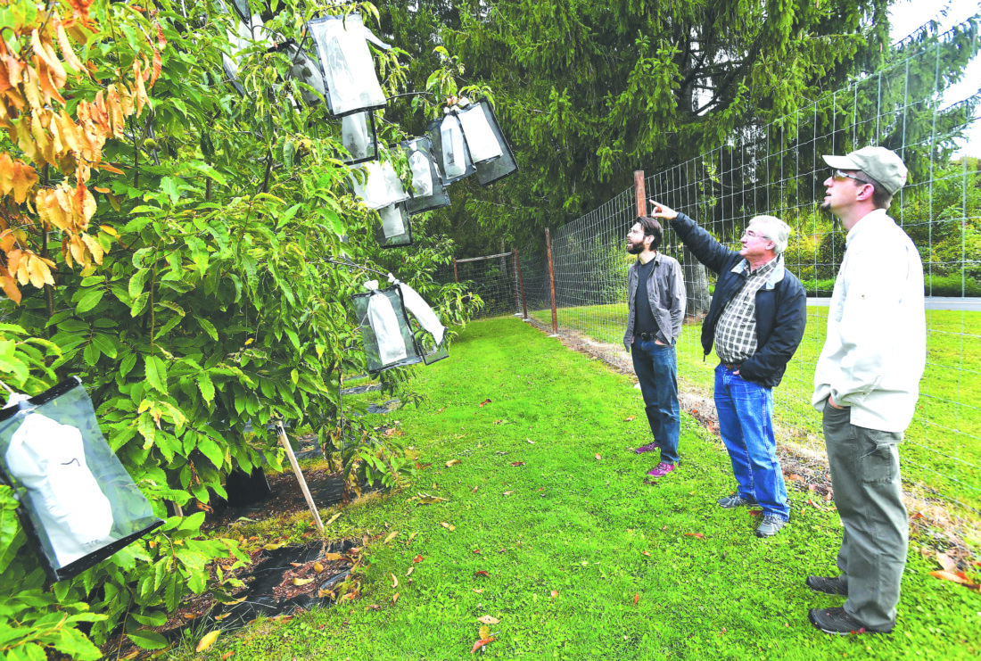 From left, Vernon Coffey, William Powell and Andy Newhouse prepare to harvest genetically modified chestnut samples at the State University of New York's College of Environmental Science & Forestry Lafayette Road Experiment Station in Syracuse, N.Y., on Sept. 30, 2019. (AP file photo)