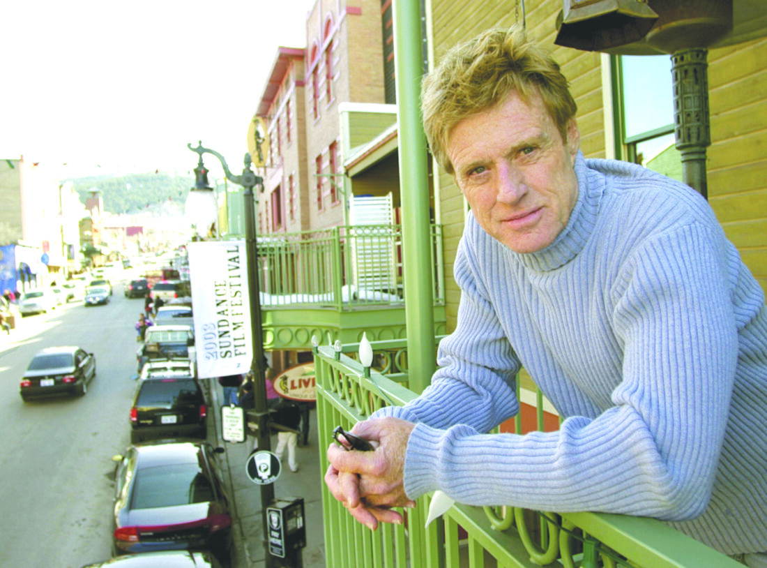 Robert Redford poses on a balcony along Main Street decorated with his Sundance Film Festival banners on Jan. 17, 2003, in Park City, Utah. (AP file photo)