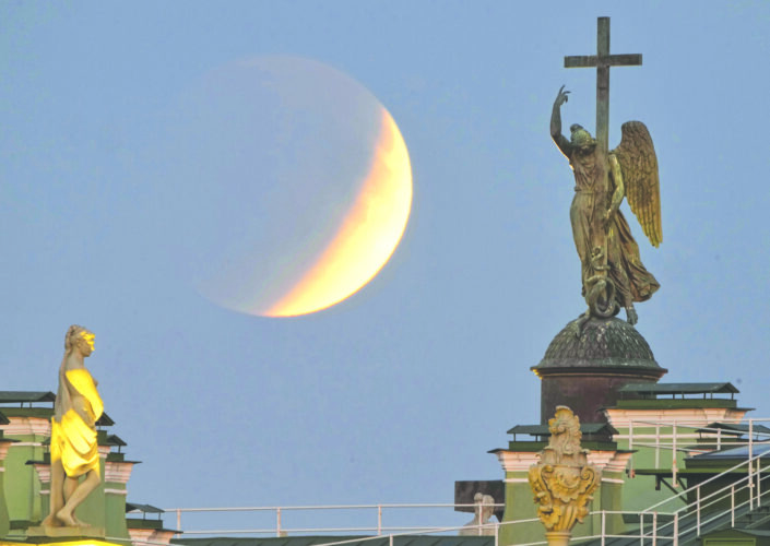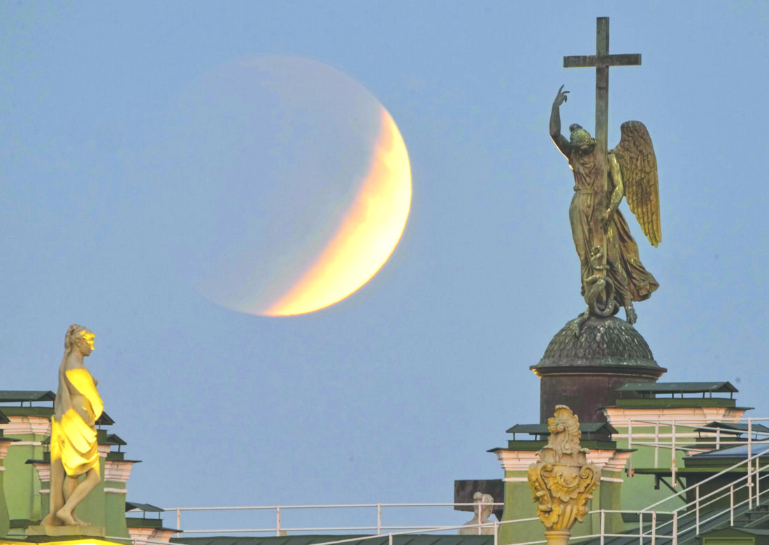 The full moon rises behind a statue of an angel fixed atop the Alexander Column at the Palace Square for a total lunar eclipse in St. Petersburg, Russia, on Sept. 7. (AP file photo)